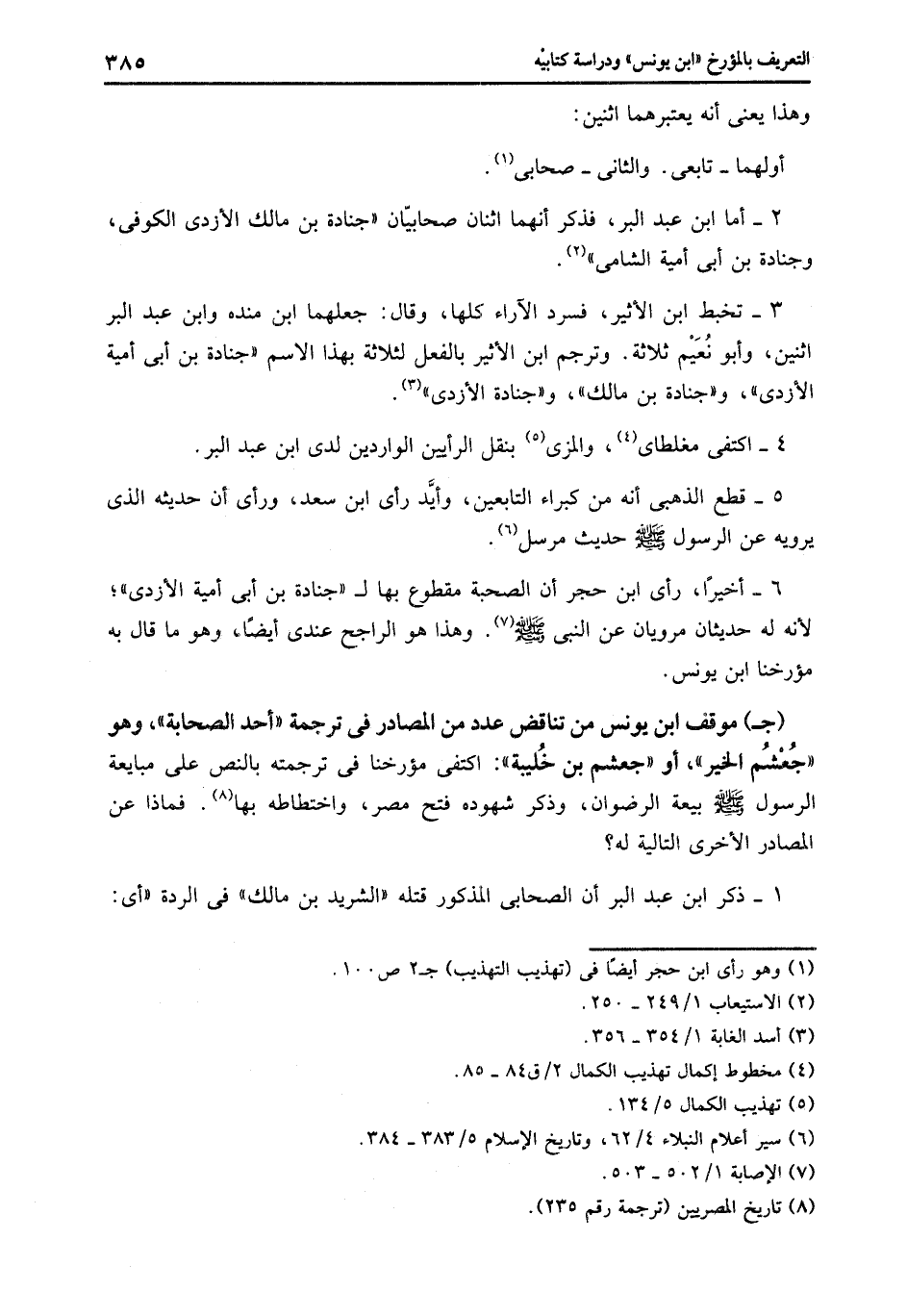 6- أخيرا، رأى ابن حجر أن الصحبة مقطوع بها ل «جنادة بن أبى أمية الأزدى» ؛ لأنه له حديثان مرويان عن النبي صلى الله عليه وسلم «7» . وهذا هو الراجح عندى أيضا، وهو ما قال به مؤرخنا ابن يونس.