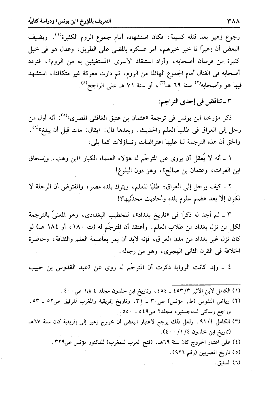 3- لم أجد له ذكرا فى «تاريخ بغداد» ، للخطيب البغدادى، وهو المعنىّ بالترجمة لكل من نزل بغداد من طلاب العلم. وأعتقد أن المترجم له (ت 180، أو 184 هـ) لو كان نزل غير بغداد من مدن العراق، فإنه لابد أن يمر بعاصمة العلم والثقافة، وحاضرة الخلافة فى القرن الثانى الهجرى، وهو من رجاله.