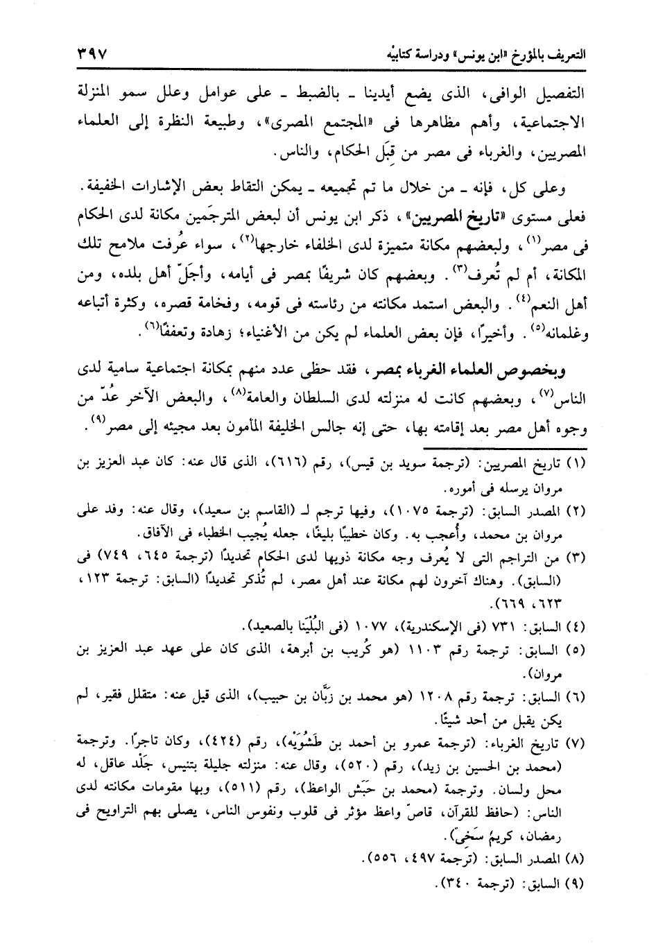 فعلى مستوى «تاريخ المصريين» ، ذكر ابن يونس أن لبعض المترجمين مكانة لدى الحكام فى مصر «1» ، ولبعضهم مكانة متميزة لدى الخلفاء خارجها «2» ، سواء عرفت ملامح تلك المكانة، أم لم تعرف «3» . وبعضهم كان شريفا بمصر فى أيامه، وأجلّ أهل بلده، ومن أهل النعم «4» . والبعض استمد مكانته من رئاسته فى قومه، وفخامة قصره، وكثرة أتباعه وغلمانه «5» . وأخيرا، فإن بعض العلماء لم يكن من الأغنياء؛ زهادة وتعففا «6» .