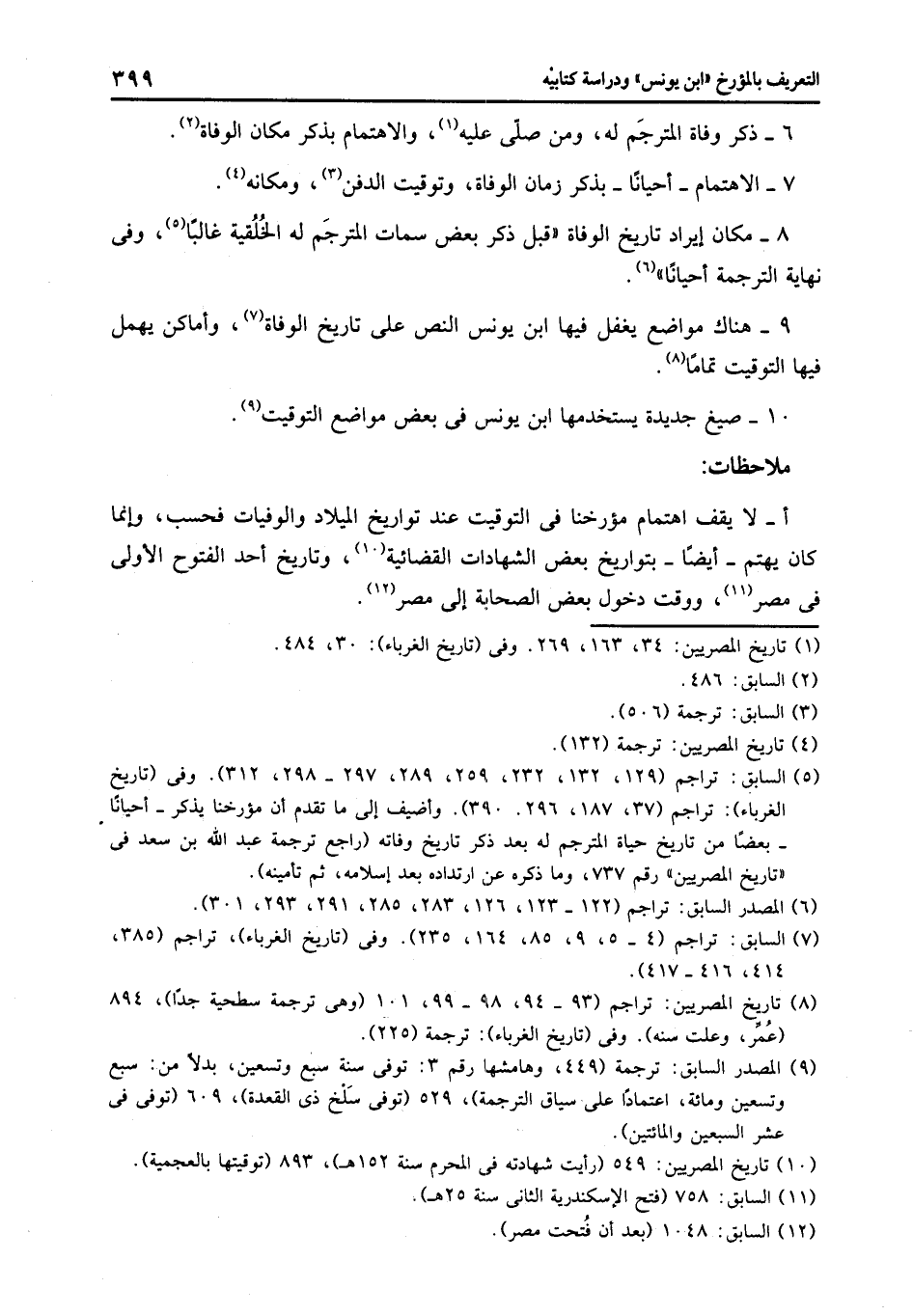 9- هناك مواضع يغفل فيها ابن يونس النص على تاريخ الوفاة «7» ، وأماكن يهمل فيها التوقيت تماما «8» .
