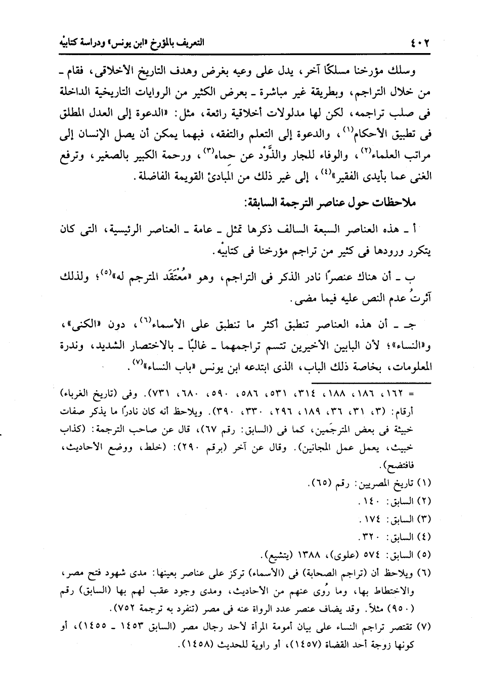 ج- أن هذه العناصر تنطبق أكثر ما تنطبق على الأسماء «6» ، دون «الكنى» ، و «النساء» ؛ لأن البابين الأخيرين تتسم تراجمهما- غالبا- بالاختصار الشديد، وندرة المعلومات، بخاصة ذلك الباب، الذي ابتدعه ابن يونس «باب النساء» «7» .