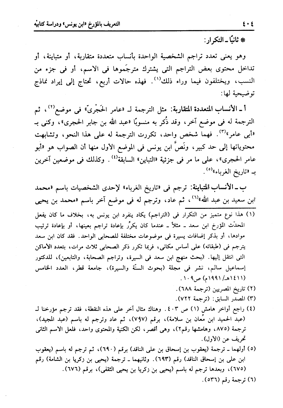 أ- الأنساب المتعددة المتقاربة: مثل الترجمة ل «عامر الحجرىّ» فى موضع «2» ، ثم الترجمة له فى موضع آخر، وقد ذكر به منسوبا «عبد الله بن جابر الحجرى» ، وكنى ب «أبى عامر» «3» . فهما شخص واحد، تكررت الترجمة له على هذا النحو، وتشابهت محتوياتها إلى حد كبير، ونصّ ابن يونس فى الموضع الأول منها أن الصواب هو «أبو عامر الحجرى» ، على ما مر فى جزئية «التباين» السابقة «4» . وكذلك فى موضعين آخرين ب «تاريخ الغرباء» «5» .