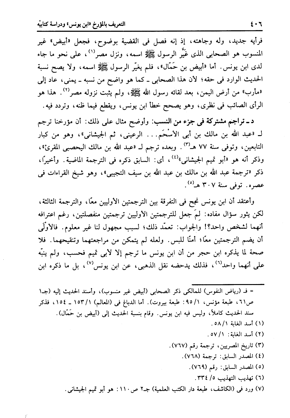 وأعتقد أن ابن يونس نجح فى التفرقة بين الترجمتين الأوليين معا، والترجمة الثالثة، لكن يثور سؤال مفاده: لم جعل للترجمتين الأوليين ترجمتين منفصلتين، رغم اعترافه أنهما لشخص واحد؟! والجواب: تعمّد ذلك؛ لسبب مجهول لنا غير معلوم. فالأولى أن يضم الترجمتين معا؛ أمنا للبس. ولعله لم يتمكن من مراجعتهما وتنقيحهما. فلا صحة لما يذكره ابن حجر من أن ابن يونس ما ترجم إلا لأبى تميم فحسب، ولم ينبّه على أنهما واحد «6» ، فذلك يدحضه نقل الذهبى، عن ابن يونس «7» ، بل ما ذكره ابن