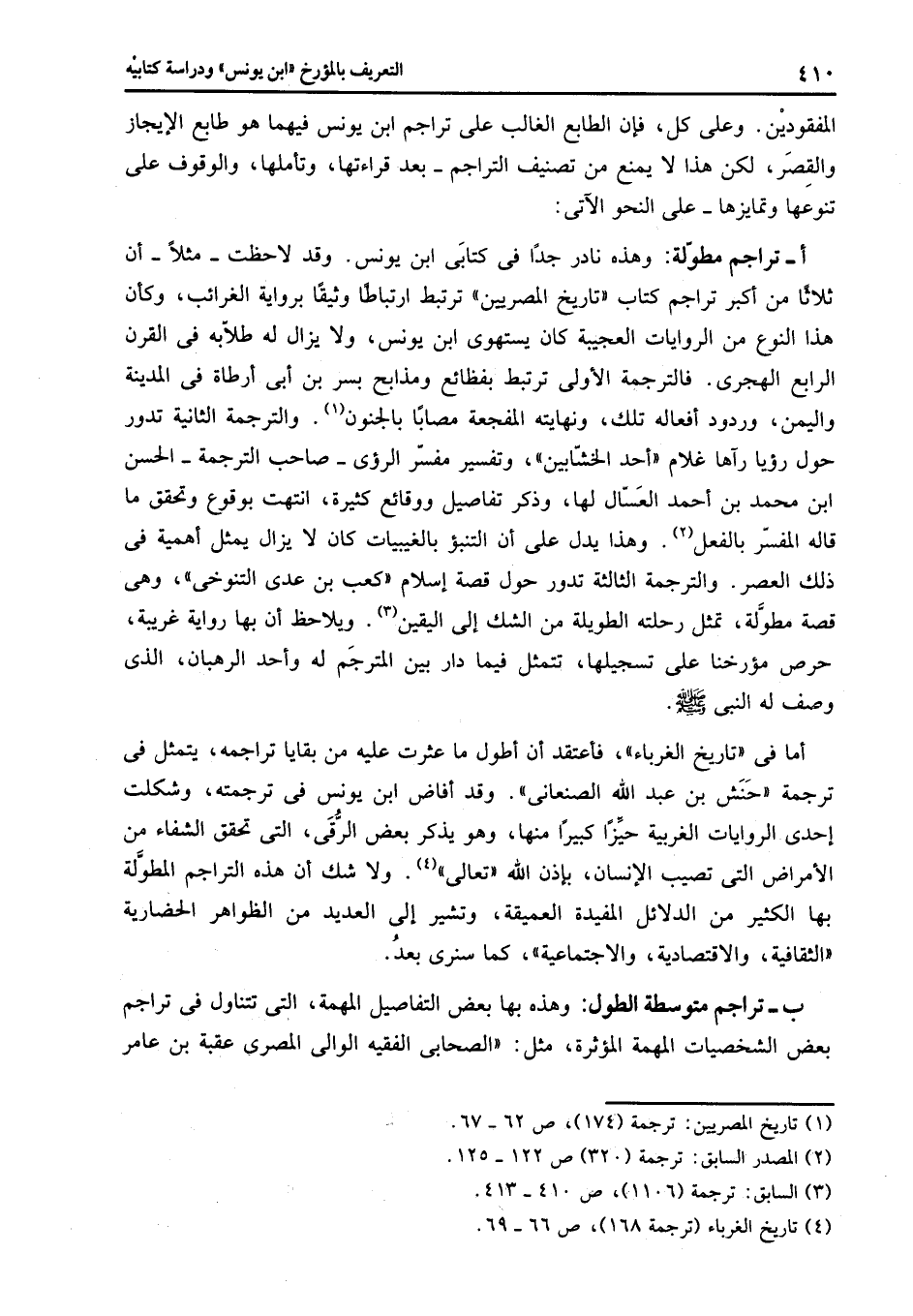 أما فى «تاريخ الغرباء» ، فأعتقد أن أطول ما عثرت عليه من بقايا تراجمه، يتمثل فى ترجمة «حنش بن عبد الله الصنعانى» . وقد أفاض ابن يونس فى ترجمته، وشكلت إحدى الروايات الغربية حيّزا كبيرا منها، وهو يذكر بعض الرّقى، التى تحقق الشفاء من الأمراض التى تصيب الإنسان، بإذن الله «تعالى» «4» . ولا شك أن هذه التراجم المطوّلة بها الكثير من الدلائل المفيدة العميقة، وتشير إلى العديد من الظواهر الحضارية «الثقافية، والاقتصادية، والاجتماعية» ، كما سنرى بعد.