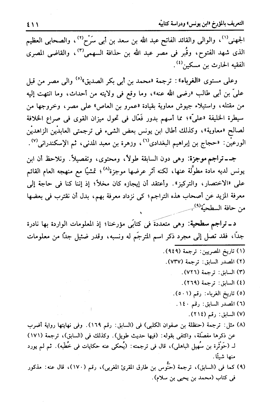 ج- تراجم موجزة: وهى دون السابقة طولا، ومحتوى، وتفصيلا. ونلاحظ أن ابن يونس لديه مادة مطوّلة عنها، لكنه آثر عرضها موجزة «8» ؛ تمشيا مع منهجه العام القائم على «الاختصار، والتركيز» . وأعتقد أن إيجازه كان مخلا؛ إذ إننا كنا فى حاجة إلى معرفة المزيد عن أصحاب هذه التراجم؛ كى نزداد معرفة بهم، بدل أن نقترب فى بعضها من حافة السطحيّة «9» .