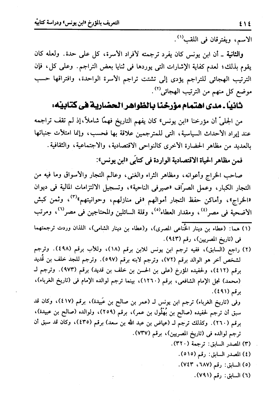والثانية- أن ابن يونس كان يفرد ترجمته لأفراد الأسرة، كل على حدة. ولعله كان يقوم بذلك؛ لعدم كفاية الإشارات التى يوردها فى ثنايا بعض التراجم. وعلى كل، فإن الترتيب الهجائى للتراجم يؤدى إلى تشتت تراجم الأسرة الواحدة، وافتراقها حسب موضع كل منهم من الترتيب الهجائى «2» .