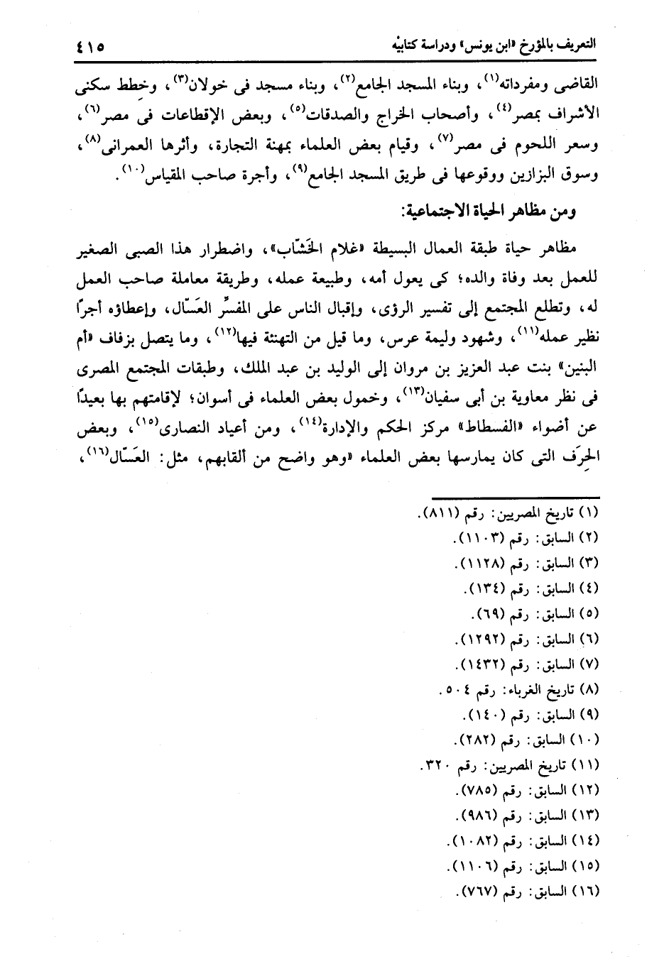 القاضى ومفرداته «1» ، وبناء المسجد الجامع «2» ، وبناء مسجد فى خولان «3» ، وخطط سكنى الأشراف بمصر «4» ، وأصحاب الخراج والصدقات «5» ، وبعض الإقطاعات فى مصر «6» ، وسعر اللحوم فى مصر «7» ، وقيام بعض العلماء بمهنة التجارة، وأثرها العمرانى «8» ، وسوق البزازين ووقوعها فى طريق المسجد الجامع «9» ، وأجرة صاحب المقياس «10» .