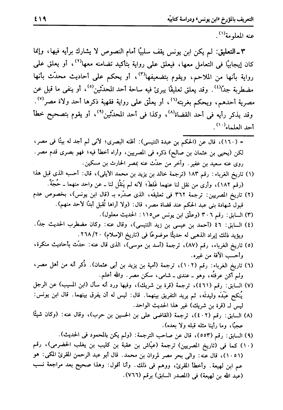 3- التعليق: لم يكن ابن يونس يقف سلبيا أمام النصوص لا يشارك برأيه فيها، وإنما كان إيجابيا فى التعامل معها، فيعلق على رواية بتأكيد تضامنه معها «2» ، أو يعلق على رواية بأنها من الملاحم، ويقوم بتضعيفها «3» ، أو يحكم على أحاديث محدّث بأنها مضطربة جدا «4» . وقد يعلق تعليقا يبرئ فيه ساحة أحد المحدّثين «5» ، أو ينفى ما قيل عن مصرية أحدهم، ويحكم بغربته «6» ، أو يعلّق على رواية فقهية ذكرها أحد ولاة مصر «7» .