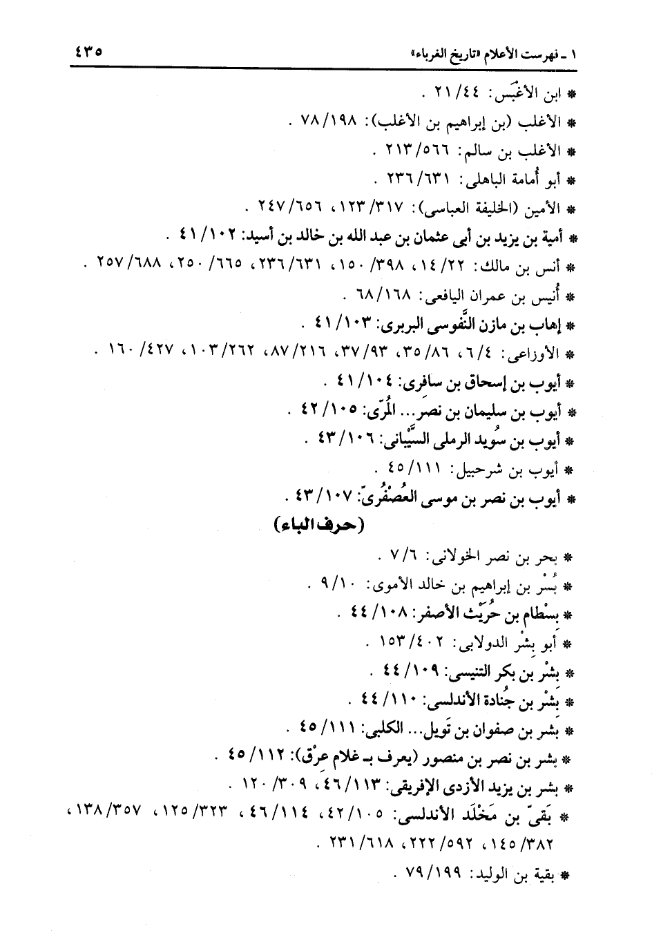 * بقىّ بن مخلد الأندلسى: 105/42، 114/46، 323/125، 357/138، 382/145، 592/222، 618/231.