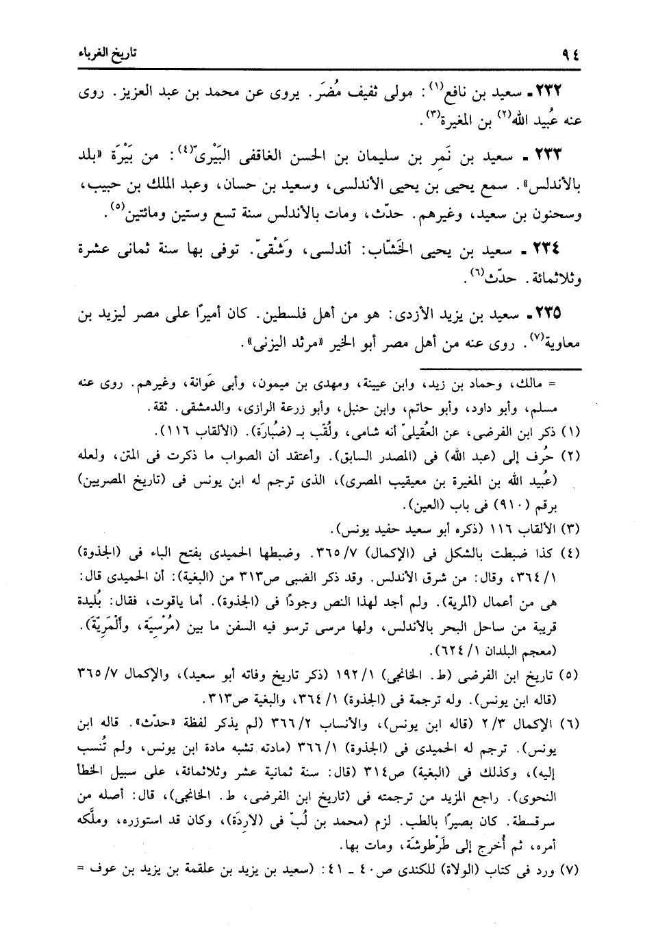 233- سعيد بن نمر بن سليمان بن الحسن الغاقفى البيرىّ «4» : من بيرة «بلد بالأندلس» . سمع يحيى بن يحيى الأندلسى، وسعيد بن حسان، وعبد الملك بن حبيب، وسحنون بن سعيد، وغيرهم. حدّث، ومات بالأندلس سنة تسع وستين ومائتين «5» .