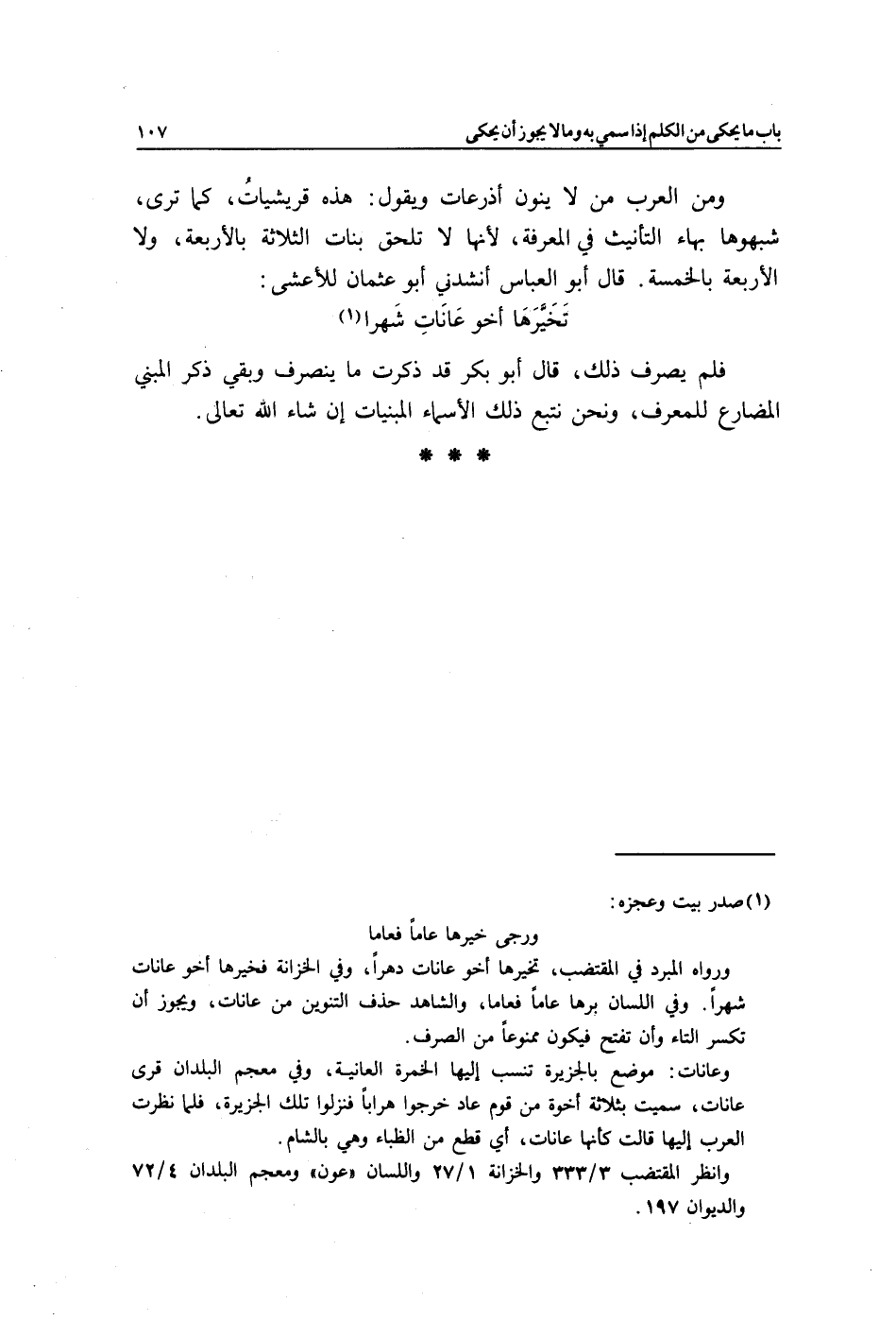 ورواه المبرد في المقتضب: تخيرها أخو عانات دهرا، وفي الخزانة: فخيرها أخو عانات شهرا, وفي اللسان: برها عامًا فعاما، والشاهد حذف التنوين من عانات، ويجوز أن تكسر التاء وأن تفتح فيكون ممنوعًا من الصرف.