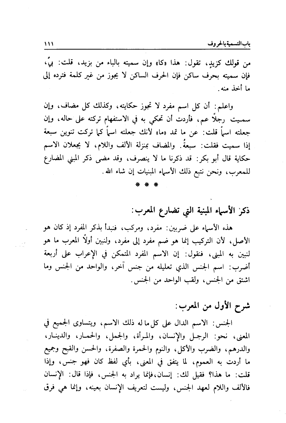 هذه الأسماء على ضربين: مفرد ومركب, فنبدأ بذكر المفرد إذ كان هو الأصل؛ لأن التركيب إنما هو ضم مفرد إلى مفرد، ولنبين أولًا المعرب ما هو لنبين به المبني، فنقول: إن الاسم المفرد المتمكن في الإِعراب على أربعة أضرب: اسم الجنس الذي تعليله من جنس آخر، والواحد من الجنس, وما اشتق من الجنس, ولقب الواحد من الجنس.
