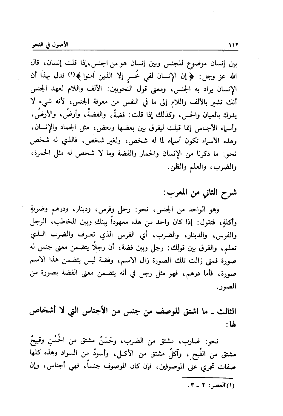 بين إنسان موضوع للجنس وبين إنسان هو من الجنس، إذا قلت إنسان, قال الله عز وجل: {إِنَّ الْإِنْسَانَ لَفِي خُسْرٍ، إِلَّا الَّذِينَ آمَنُوا} 1 فدل بهذا أن الإِنسان يراد به الجنس، ومعنى قول النحويين: الألف واللام لعهد الجنس أنك تشير بالألف واللام إلى ما في النفس من معرفة الجنس؛ لأنه شيء لا يدرك بالعيان والحس، وكذلك إذا قلت: فضةٌ والفضةُ, وأرضٌ والأرضُ, وأسماء الأجناس إنما قيلت ليفرق بين بعضها وبعض, مثل الجماد والإِنسان، وهذه الأسماء تكون أسماء لما له شخص ولغير شخص, فالذي له شخص نحو: ما ذكرنا من الإِنسان والحمار والفضة, وما لا شخص له مثل الحمرة والضرب والعلم والظن.