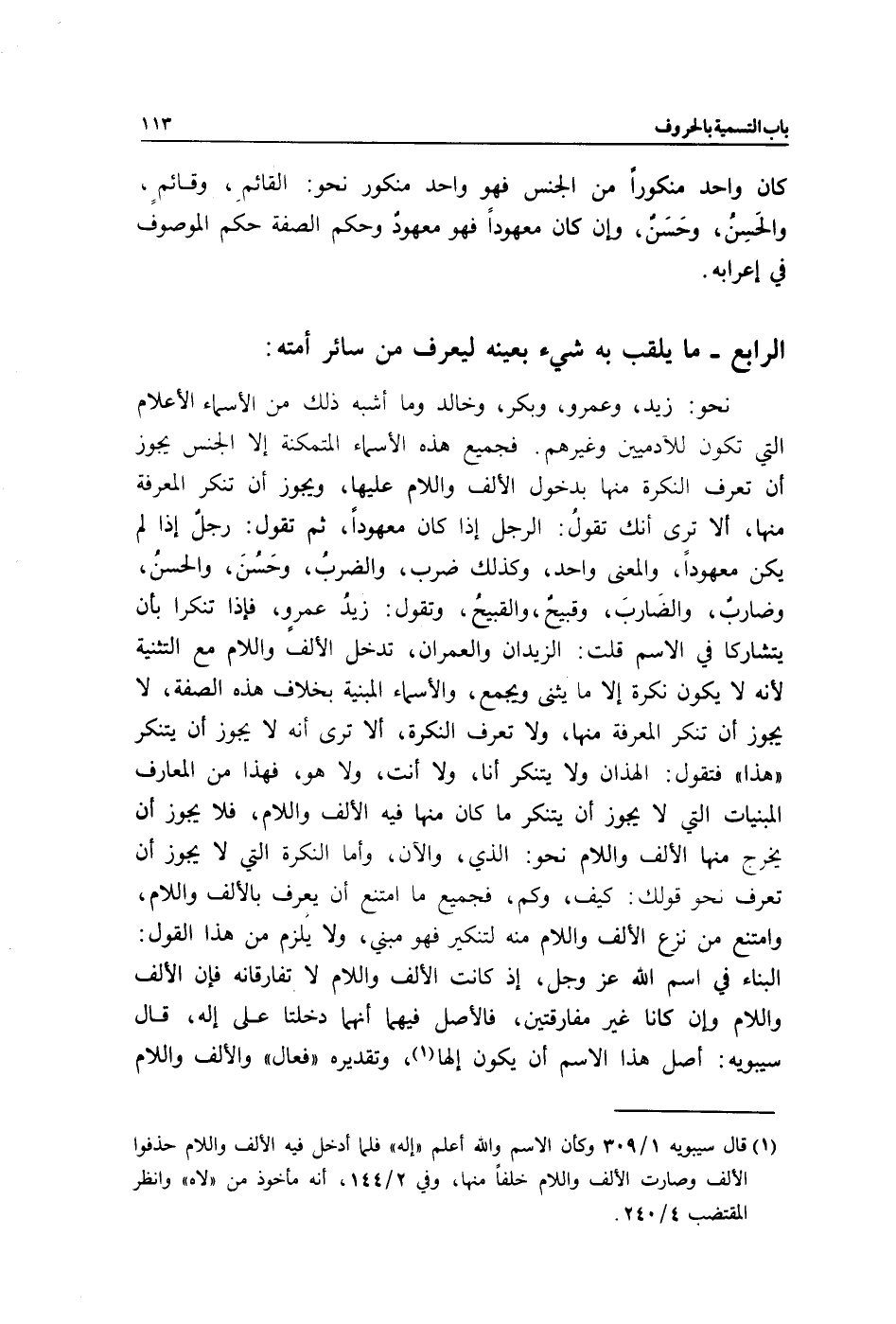 نحو: زيد وعمرو وبكر وخالد وما أشبه ذلك من الأسماء الأعلام التي تكون للآدميين وغيرهم. فجميع هذه الأسماء المتمكنة إلا الجنس يجوز أن تعرف النكرة منها بدخول الألف واللام عليها، ويجوز أن تنكر المعرفة منها، ألا ترى أنك تقولُ: الرجل إذا كان معهودًا، ثم تقول: رجلٌ إذا لم يكن معهودًا والمعنى واحد وكذلك ضرب, والضربُ, وحَسُنَ، والحسنُ، وضاربٌ، والضَارب، وقبيحٌ، والقبيحُ، وتقول: زيدُ عمرٍو, فإذا تنكرا بأن يتشاركا في الاسم قلت: الزيدان والعمران تدخل الألف واللام مع التثنية؛ لأنه لا يكون نكرة إلا ما يثنى ويجمع, والأسماء المبنية بخلاف هذه الصفة, لا يجوز أن تنكر المعرفة منها ولا تعرف النكرة، ألا ترى أنه لا يجوز أن يتنكر "هذا" فتقول: الهذان ولا يتنكر أنا, ولا أنت, ولا هو, فهذا من المعارف المبنيات التي لا يجوز أن يتنكر ما كان منها فيه الألف واللام، فلا يجوز أن يخرج منها الألف واللام نحو: الذي والآن، وأما النكرة التي لا يجوز أن تعرف نحو قولك: كيف وكم, فجميع ما امتنع أن يعرف بالألف واللام, وامتنع من نزع الألف واللام منه لتنكير فهو مبني, ولا يلزم من هذا القول البناء في اسم الله عز وجل، إذ كانت الألف واللام لا تفارقانه فإن الألف واللام وإن كانتا غير مفارقتين, فالأصل فيهما أنهما دخلتا على إله, قال سيبويه: أصل هذا الاسم أن يكون إلها1, وتقديره "فعال" والألف واللام