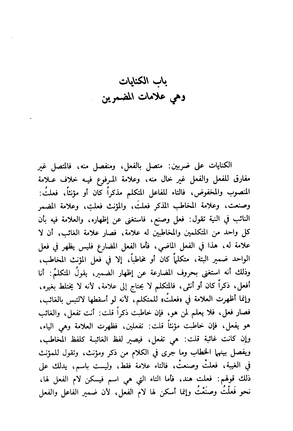 الكنايات على ضربين: متصل بالفعل ومنفصل عنه، فالمتصل غير مفارق للفعل, والفعل غير خالٍ منه، وعلامة المرفوع فيه خلاف علامة المنصوب والمخفوض, فالتاء للفاعل المتكلم مذكرًا كان أو مؤنثًا فعلتُ وصنعتُ وعلامة المخاطب المذكر فعلتَ, والمؤنث فعلتِ, وعلامة المضمر النائب في النية تقول: فعل وصنع، فاستغنى عن إظهاره والعلامة فيه بأن كل واحد من المتكلمين والمخاطبين له علامة, فصار علامة الغائب أن لا علامة له, هذا في الفعل الماضي, فأما الفعل المضارع فليس يظهر في فعل الواحد ضمير ألبتة, متكلمًا كان أو مخاطبًا إلا في فعل المؤنث المخاطب, وذلك أنه استغنى بحروف المضارعة عن إظهار الضمير, يقولُ المتكلمُ: أنا أفعل, ذكرًا كان أو أنثى فالمتكلم لا يحتاج إلى علامة؛ لأنه لا يختلط بغيره, وإنما أظهرت العلامة في "فعلتُ" للمتكلم؛ لأنه لو أسقطها لالتبس بالغائب، فصار فعل, فلا يعلم لمن هو, فإن خاطبت ذكرًا قلت: أنت تفعل، والغائب هو يفعل، فإن خاطبت مؤنثًا قلت: تفعلين, فظهرت العلامة وهي الياء, وإن كانت غائبة قلت: هي تفعل فيصير لفظ الغائبة كلفظ المخاطب, ويفصل بينهما الخطاب وما جرى في الكلام من ذكر ومؤنث, وتقول للمؤنث في الغيبة: فعلتْ وصنعتْ, فالتاء علامة فقط وليست باسمٍ, يدلك على ذلك قولهم: فعلت هند، فأما التاء التي هي اسم فيسكن لام الفعل لها، نحو فَعلْتُ وصنَعْتُ وإنما أسكن لها لام الفعل؛ لأن ضمير الفاعل والفعل