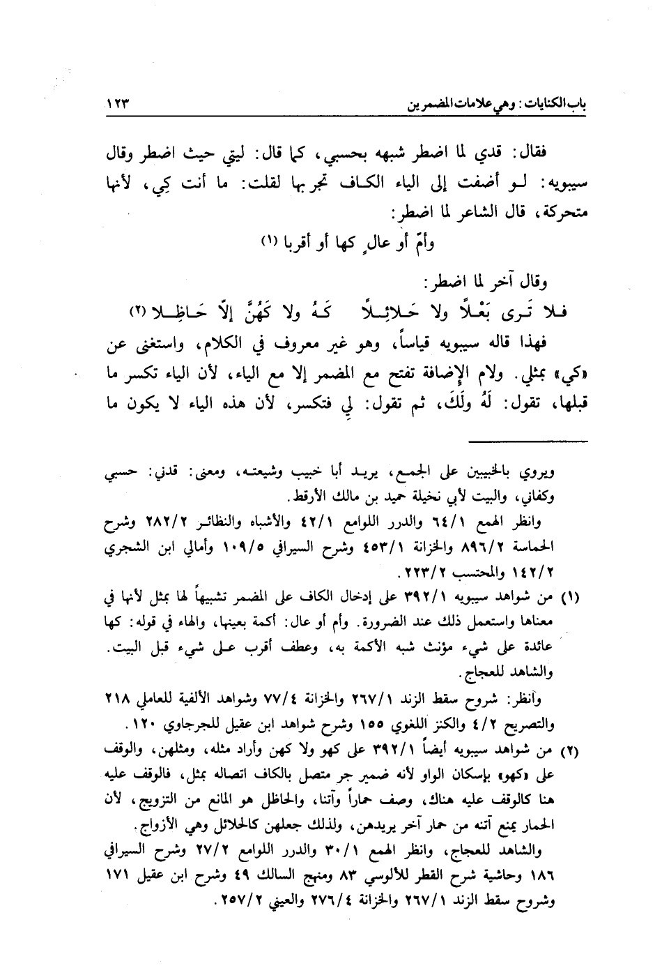 فقال: قدي لما اضطر شبهه بحسبي، كما قال: ليتي حيث اضطر, وقال سيبويه: لو أضفت إلى الياء الكاف تجر بها لقلت: ما أنت كِي؛ لأنها متحركة قال الشاعر لما اضطر: