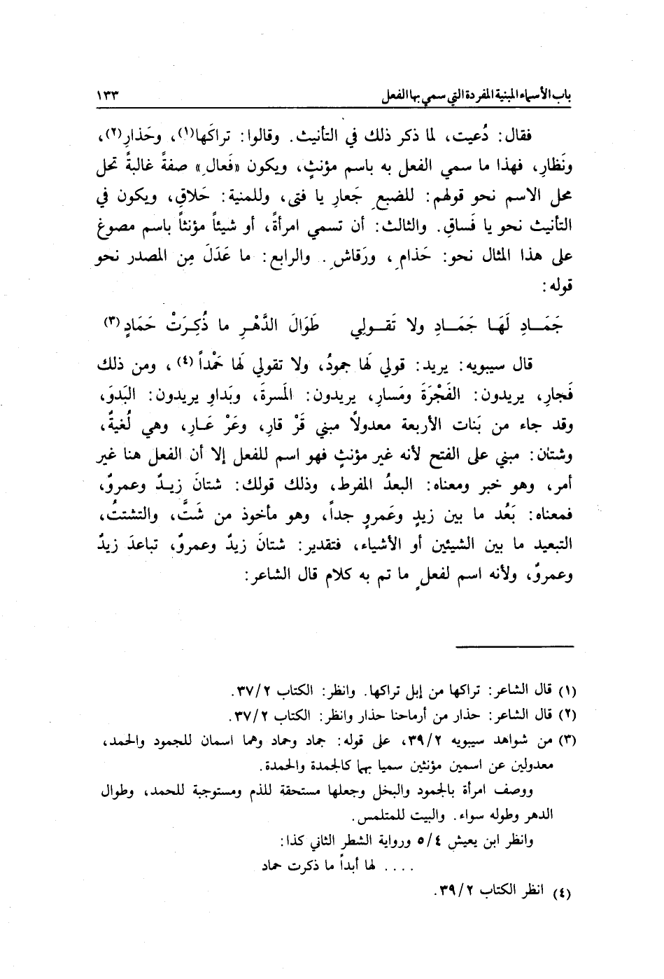 فقال: دُعيت, لما ذكر ذلك في التأنيث. وقالوا: تراكَها1، وحَذارِ2، ونَظارِ، فهذا ما سمي الفعل به باسم مؤنثٍ، ويكون "فَعالِ" صفةً غالبةً تحل محل الاسم نحو قولهم للضبعِ: جَعارِ يا فتى, وللمنية: حَلاقِ ويكون في التأنيث نحو: يا فَساقِ. والثالث: أن تسمي امرأةً، أو شيئًا مؤنثًا باسم مصوغ على هذا المثال نحو: حَذامِ ورَقاشِ. والرابع: ما عَدَلَ مِن المصدر نحو قوله: