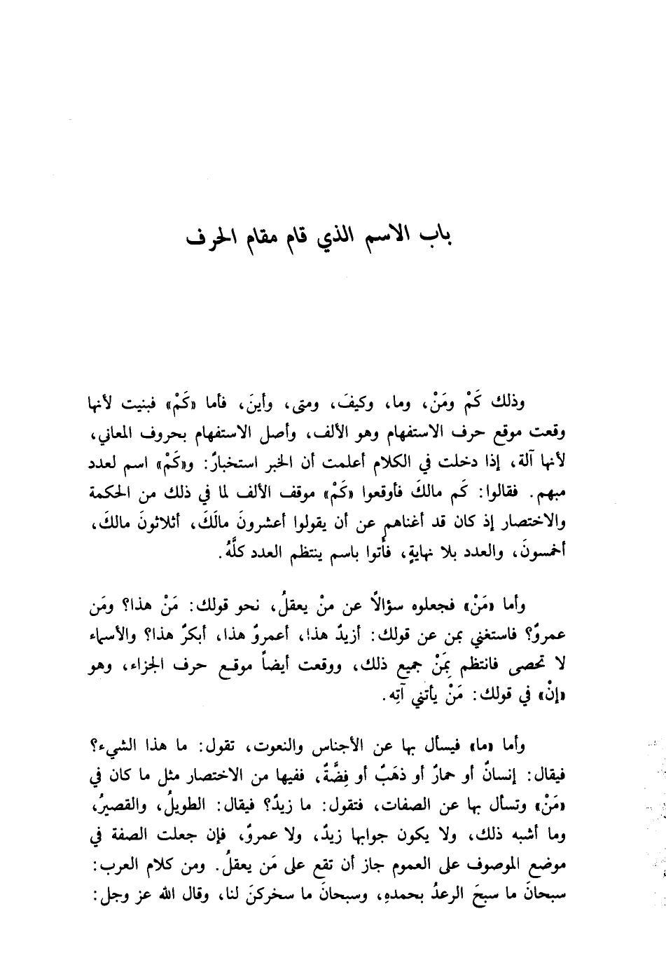 وأما "ما" فيسأل بها عن الأجناس والنعوت، تقول: ما هذا الشيء؟ فيقال: إنسانٌ أو حمارٌ أو ذهَبٌ أو فِضَّةٌ، ففيها من الاختصار مثل ما كان في "مَنْ" وتسأل بها عن الصفات، فتقول: ما زيدٌ؟ فيقال: الطويلُ والقصيرُ، وما أشبه ذلك, ولا يكون جوابها: زيدٌ ولا عمرٌو, فإن جعلت الصفة في موضع الموصوف على العموم جاز أن تقع على مَن يعقلُ. ومن كلام العرب: سبحانَ ما سبحَ الرعدُ بحمدهِ، وسبحانَ ما سخركن لنا، وقال الله عز وجل: