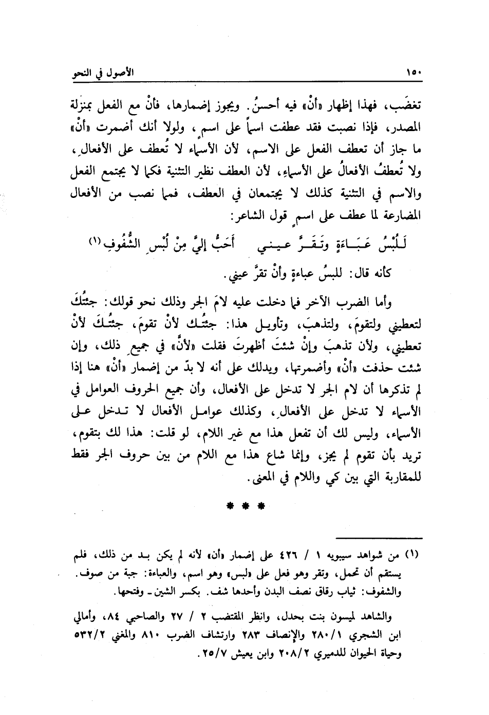 1 من شواهد سيبويه 1/ 426 على إضمار "أن" لأنه لم يكن بد من ذلك، فلم يستقم أن تحمل، وتقر, وهو فعل على "لبس" وهو اسم، والعباءة: جبة من صوف, والشفوف: ثياب رقاق نصف البدن واحدها شف, بكسر الشين وفتحها.