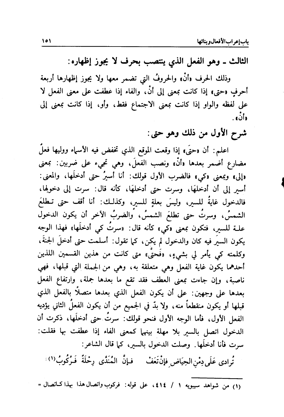 1 من شواهد سيبويه 1/ 414 على قوله: فركوب واتصال هذا بهذا كاتصال الدخول بالسير في قولهم: سرت حتى أدخل، أي: كان مني سير فدخول.