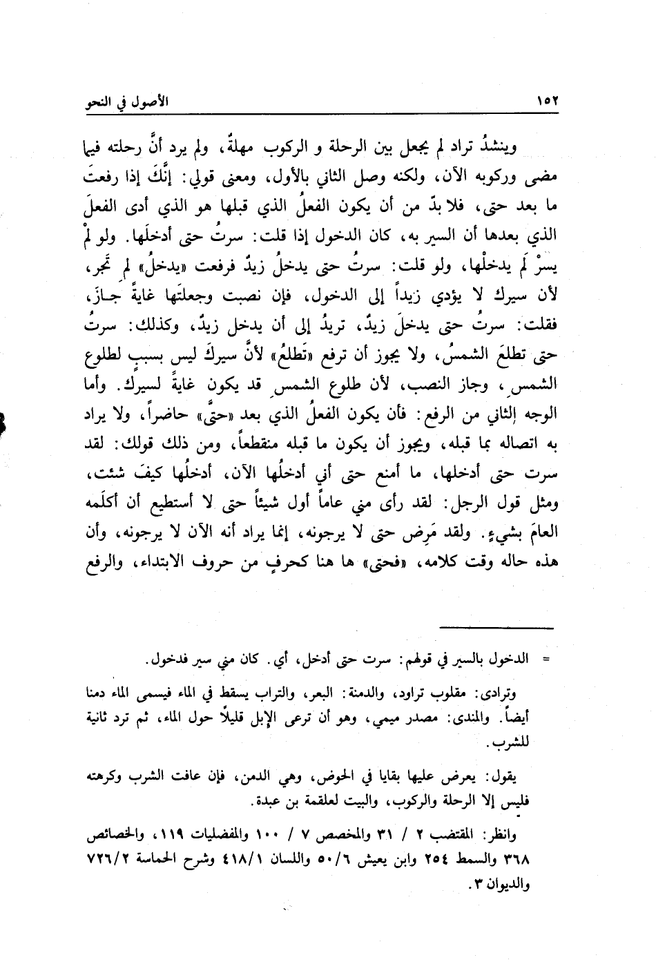 وينشدُ تراد لم يجعل بين الرحلة والركوب مهلة, ولم يرد أنَّ رحلته فيما مضى وركوبه الآن, ولكنه وصل الثاني بالأول، ومعنى قولي: إنَّكَ إذا رفعتَ ما بعد حتى, فلا بدّ من أن يكون الفعلُ الذي قبلها هو الذي أدى الفعلَ الذي بعدها أن السير به, كان الدخول إذا قلت: سرتُ حتى أدخلَها, ولو لمْ يسرْ لَم يدخلْها، ولو قلت: سرتُ حتى يدخلُ زيدٌ فرفعت "يدخلُ" لم تَجر؛ لأن سيرك لا يؤدي زيدًا إلى الدخول، فإن نصبت وجعلتَها غايةً جازَ فقلت: سرتُ حتى يدخلَ زيدٌ, تريدُ إلى أن يدخل زيدٌ، وكذلك: سرتُ حتى تطلعَ الشمسُ ولا يجوز أن ترفع "تَطلعُ" لأنَّ سيركَ ليس بسببٍ لطلوع الشمسِ وجاز النصب لأن طلوع الشمسِ قد يكون غايةً لسيرك. وأما الوجه الثاني من الرفع: فأن يكون الفعلُ الذي بعد "حتَّى" حاضرًا ولا يراد به اتصاله بما قبله، ويجوز أن يكون ما قبله منقطعًا، ومن ذلك قولك: لقد سرت حتى أدخلها, ما أمنع حتى إني أدخلُها الآن, أدخلُها كيفَ شئت، ومثل قول الرجل: لقد رأى مني عامًا أول شيئًا حتى لا أستطيع أن أكلمه العامَ بشيءٍ. ولقد مَرِض حتى لا يرجونه, إنما يراد أنه الآن لا يرجونه, وأن هذه حاله وقت كلامه, "فحتى" ههنا كحرفٍ من حروف الابتداء, والرفع