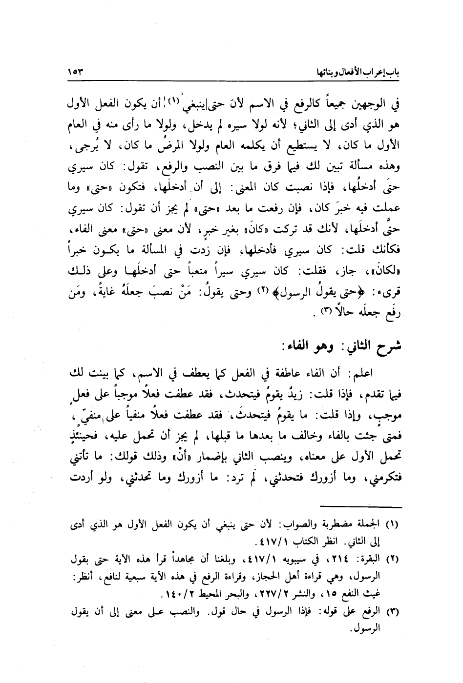 اعلم: أن الفاء عاطفة في الفعل كما يعطف في الاسم، كما بينت لك فيما تقدم، فإذا قلت: زيدٌ يقومُ فيتحدث, فقد عطفت فعلًا موجبًا على فعلٍ موجبٍ، وإذا قلت: ما يقومُ فيتحدثَ, فقد عطفت فعلًا منفيًّا على منفيّ، فمتى جئت بالفاء وخالف ما بعدها ما قبلها, لم يجز أن تحمل عليه, فحينئذٍ تحمل الأول على معناه، وينصب الثاني بإضمار "أنْ" وذلك قولك: ما تأتني فتكرمني، وما أزورك فتحدثني, لَم ترد: ما أزورك وما تحدثني، ولو أردت