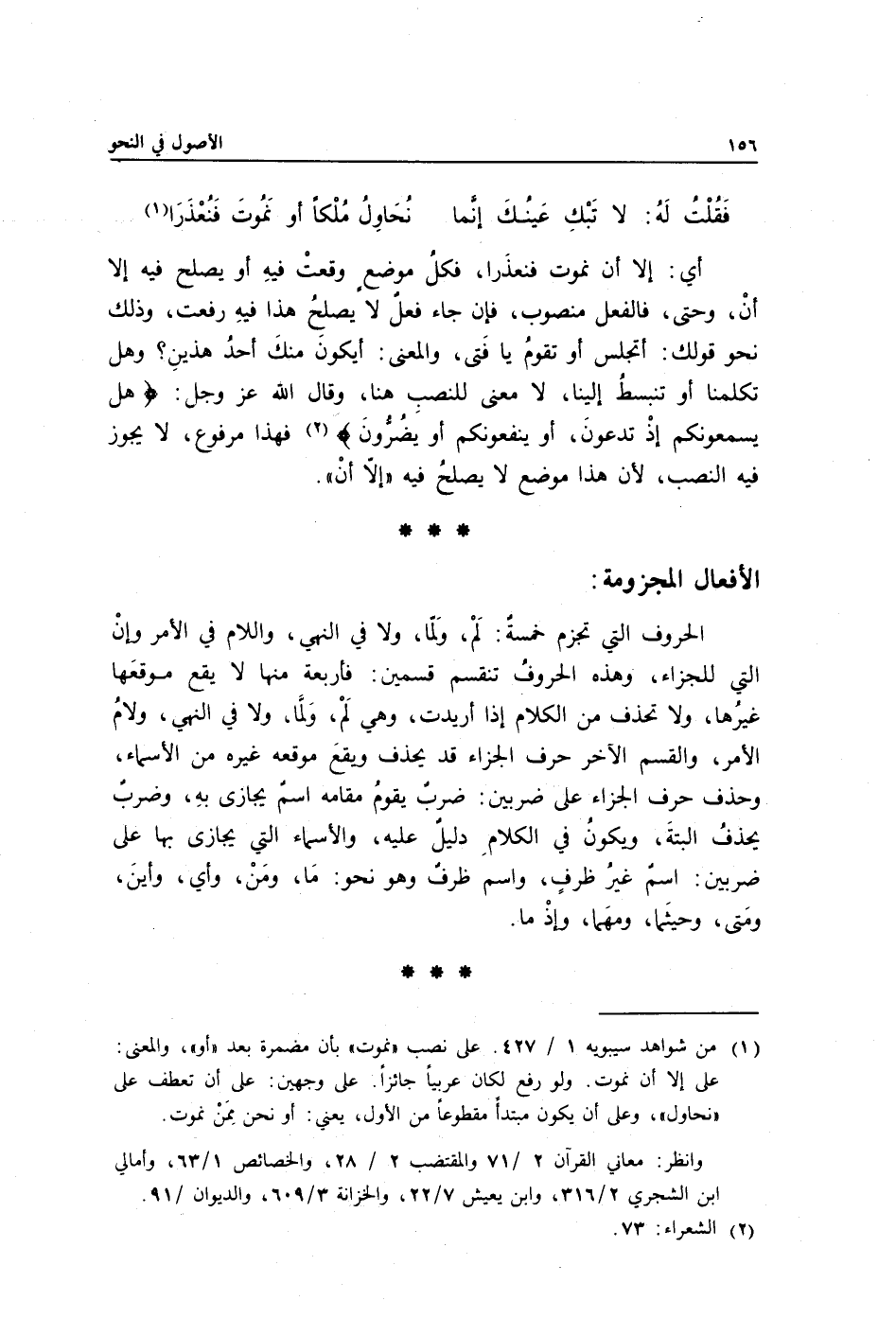 أي: إلا أن نموت فنعذَرا, فكل موضعٍ وقعتْ فيهِ أو يصلح فيه إلا أنْ وحتى, فالفعل منصوب, فإن جاء فعلٌ لا يصلحُ هذا فيهِ رفعت، وذلك نحو قولك: أتجلس أو تقومُ يا فَتى, والمعنى: أيكون منكَ أحدُ هذينِ؟ وهل تكلمنا أو تنبسطُ إلينا؟ لا معنى للنصبِ هنا، وقال الله عز وجل: {هَلْ يَسْمَعُونَكُمْ إِذْ تَدْعُونَ، أَوْ يَنْفَعُونَكُمْ أَوْ يَضُرُّونَ} 2 فهذا مرفوع، لا يجوز فيه النصب؛ لأن هذا موضع لا يصلحُ فيه "إلاّ أنْ".
