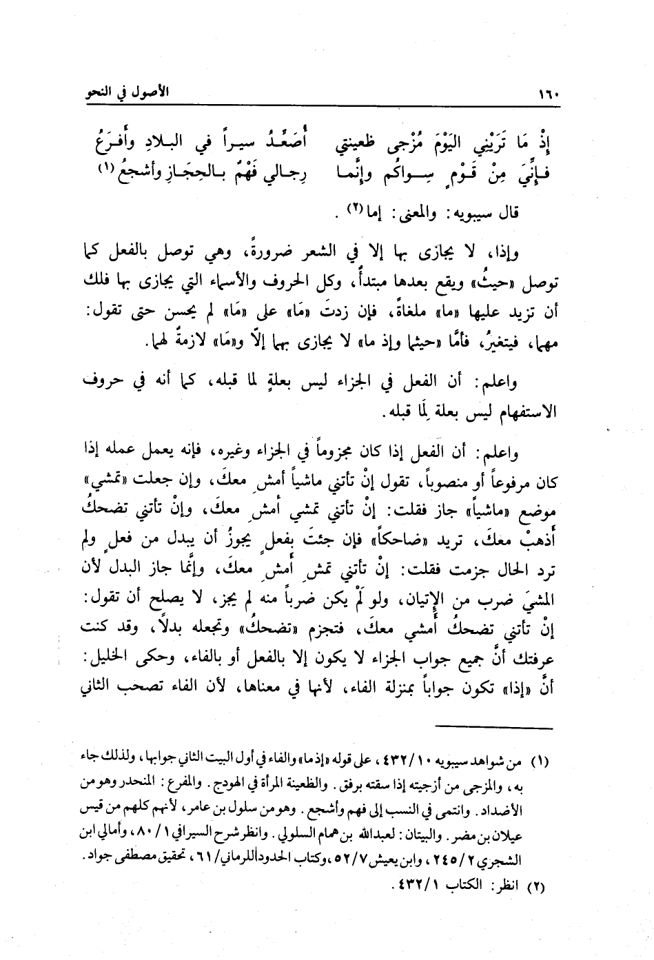1 من شواهد سيبويه 10/ 432، على قوله "إذ ما" والفاء في أول البيت الثاني جوابها؛ ولذلك جاء به، والمزجي من أزجيته إذا سقته برفق, والظعينة المرأة في الهودج, والمفرع: المنحدر وهو من الأضداد. وانتمى في النسب إلى فهم وأشجع, وهو من سلول بن عامر؛ لأنهم كلهم من قيس عيلان بن مضر, والبيتان لعبد الله بن همام السلولي. وانظر شرح السيرافي 1/ 80، وأمالي ابن الشجري 2/ 245، وابن يعيش 7/ 52، وكتاب الحدود للرماني/ 61، تحقيق مصطفى جواد.