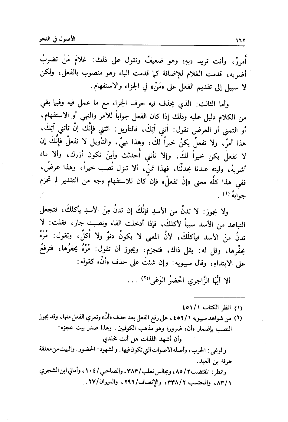 وأما الثالث: الذي يحذف فيه حرف الجزاء مع ما عمل فيه وفيما بقي من الكلام دليل عليه وذلك إذا كان الفعل جوابًا للأمر والنهي أو الاستفهام أو التمني أو العرض تقول: آتني آتِكَ فالتأويل: ائتني فإِنَّك إنْ تأتني آتِكَ، هذا أمرٌ، ولا تفعلْ يكنْ خيرًا لكَ, وهذا نهيٌ والتأويل لا تفعلْ فإِنَّكَ إن لا تفعلْ يكن خيرًا لكَ، وإلا تأتني أُحدثك وأينَ تكون أزرك, وألا ماءَ أشربهُ, وليته عندنا يحدثْنَا فهذا تمنٍّ, ألا تنزل تُصب خيرًا وهذا عرضٌ, ففي هذا كلِّه معنى "إنْ تفعلْ" فإن كان للاستفهام وجه من التقدير لم تجزم جوابهُ1.
