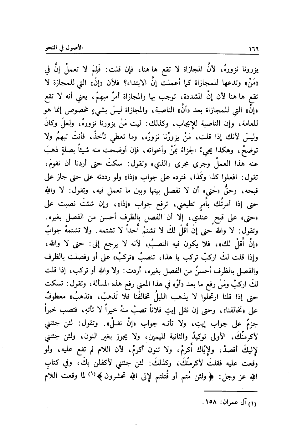 يزورنا نزورهُ؛ لأنَّ المجازاة لا تقع ههنا فإن قلت: فَلِمَ لا تعملُ إنَّ في "مَنْ" وتدعها للمجازاة كما أعملت إنَّ الابتداء؟ فلأن "إنْ" التي للمجازاة لا تقع ههنا لأن إنَّ المشددة توجب بها والمجازاة أمرٌ مبهمٌ, يعني أنه لا تقع "إنْ" التي للمجازاة بعد "أنَّ" الناصبة، والمجازاة ليست بشيءٍ مخصوص إنما هي للعامة وإن الناصبة للإِيجاب, وكذلك: ليت مَنْ يزورنا نزورُه, ولعلَ وكانَ وليسَ لأنك إذا قلت: مَنْ يزورُنا نزوره، وما تعطي تأخذْ فأنتَ تبهمُ ولا توضحُ, وهكذا يجيءُ الجزاءُ بمَنْ وأخواتها, فإن أوضحت منه شيئًا بصلةٍ ذهبَ عنه هذا العملُ وجرى مجرى "الذي" وتقول: سكتَ حتى أردنا أن نقومَ, تقول: افعلوا كذا وكَذا, فترده على جواب "إذا" ولو رددته على حتى جاز على قبحه وحقُّ "حَتى" أن لا تفصل بينها وبين ما تعمل فيه, وتقول: لا واللهِ حتى إذا أمرتُك بأَمرٍ تطيعني, ترفع جواب "إذا" وإن شئتَ نصبت على "حتى" على قبحٍ عندي، إلا أن الفصل بالظرف أحسن من الفصل بغيره. وتقول: لا والله حتى إنْ أَقلْ لكَ: لا تشتمْ أَحدًا لا تشتمه. ولا تشتمهُ جوابُ "إنْ أَقلْ لك" فلا يكون فيه النصبُ؛ لأنه لا يرجع إلى: حتى لا والله وإذا قلت لكَ: اركبْ تركب يا هذا, تنصبُ "تركب" على أو وفصلت بالظرف والفصل بالظرف أحسنُ من الفصل بغيره، أردت: ولا واللَّه أو تركب, إذا قلت لكَ اركبْ ومَنْ رفع ما بعد "أوْ" في هذا المعنى رفع هذه المسألة وتقول: تسكت حتى إذا قلنا: ارتحلوا لا يذهب الليلُ تخالفْنا فلا تَذهبْ، "تذهبُ" معطوفٌ على "تخالفنا" وحتى إن نقل: ايتِ فلانًا تصبْ منهُ خيرًا لا تأتهِ، فتصب خيرًا جزمٌ على جواب ايتِ ولا تأته جواب "إنْ نقلْ". وتقول: لئن جئتني لأكرمنّكَ, الأولى توكيدٌ والثانية لليمين, ولا يجوز بغير النون ولئن جئتني لإِليكَ أقصدْ ولإِيّاك أكرمْ، ولا تنون أكرمْ لأن اللام لم تقع عليه ولو وقعت عليه فقلتَ: لأكرمنّكَ وكذلكَ: لئن جئتني لأكفلن بكَ، وفي كتابِ اللهِ عز وجل: {وَلَئِنْ مُتُّمْ أَوْ قُتِلْتُمْ لإِلَى اللَّهِ تُحْشَرُونَ} 1 لما وقعت اللام