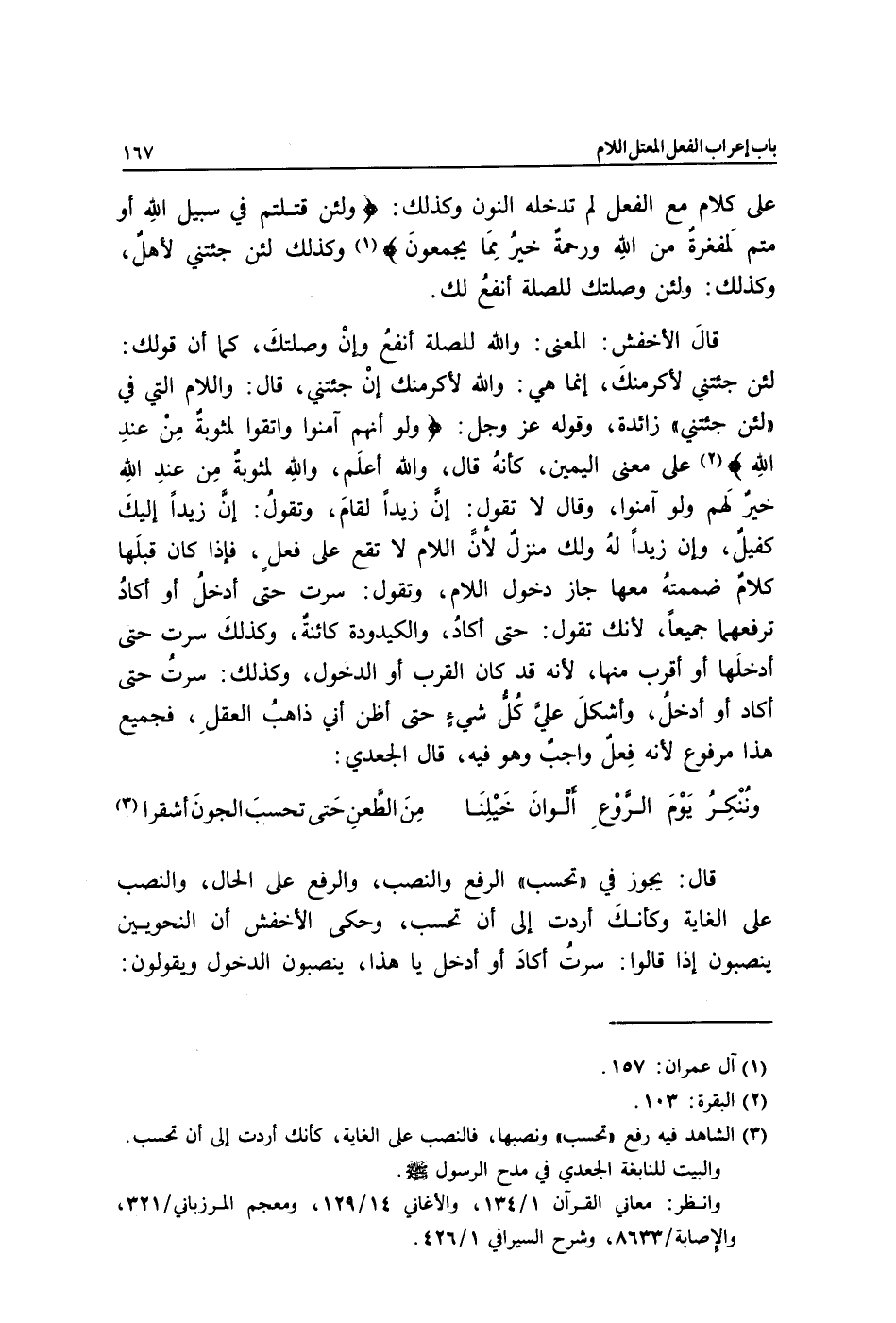 3 الشاهد فيه رفع "تحسب" ونصبها، فالنصب على الغاية، كأنك أردت إلى أن تحسب. والبيت للنابغة الجعدي في مدح الرسول, صلى الله عليه وسلم.