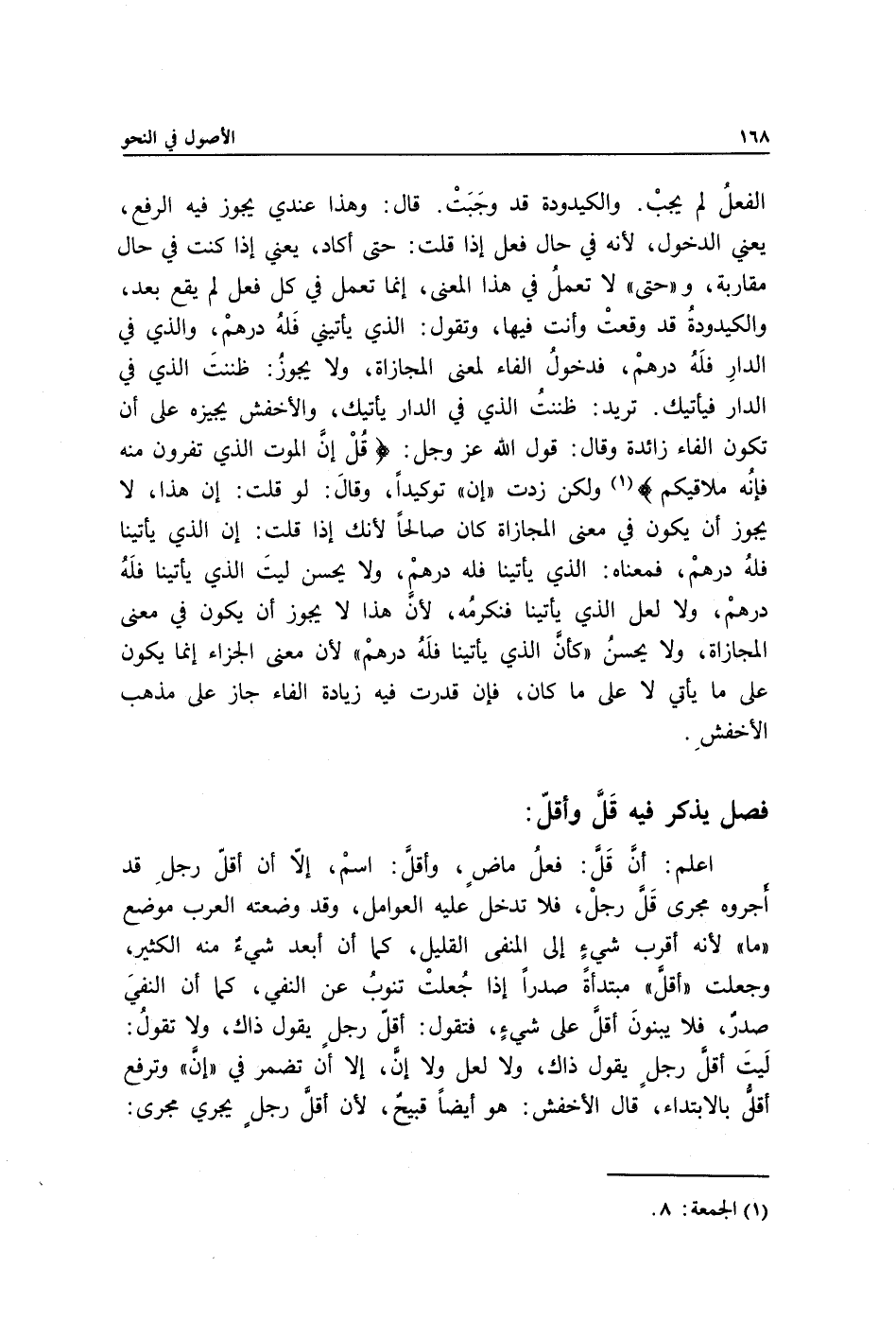 الفعلُ لم يجبْ, والكيدودة قد وجَبَتْ. قال: وهذا عندي يجوز فيه الرفع، يعني الدخول؛ لأنه في حال فعل إذا قلت: حتى أكاد, يعني إذا كنت في حال مقاربة، و"حتى" لا تعملُ في هذا المعنى, إنما تعمل في كل فعل لم يقع بعد، والكيدودةُ قد وقعتْ وأنت فيها, وتقول: الذي يأتيني فَلهُ درهم, والذي في الدارِ فلَهُ درهم, فدخولُ الفاء لمعنى المجازاة ولا يجوزُ: ظننتَ الذي في الدار فيأتيك. تريد: ظننتُ الذي في الدار يأتيك, والأخفش يجيزه على أن تكون الفاء زائدة وقال: قول الله عز وجل: {قُلْ إِنَّ الْمَوْتَ الَّذِي تَفِرُّونَ مِنْهُ فَإِنَّهُ مُلاقِيكُمْ} 1 ولكن زدت "إن" توكيدًا، وقالَ: لو قلت: إن هذا لا يجوز أن يكون في معنى المجازاة كان صالحًا؛ لأنك إذا قلت: إن الذي يأتينا فلهُ درهم، فمعناه: الذي يأتينا فله درهم, ولا يحسن ليتَ الذي يأتينا فلَهُ درهم, ولا لعل الذي يأتينا فنكرمُه؛ لأنَّ هذا لا يجوز أن يكون في معنى المجازاة، ولا يحسنُ "كأنَّ الذي يأتينا فلَهُ درهم" لأن معنى الجزاء إنما يكون على ما يأتي لا على ما كان، فإن قدرت فيه زيادة الفاء جاز على مذهب الأخفشِ.
