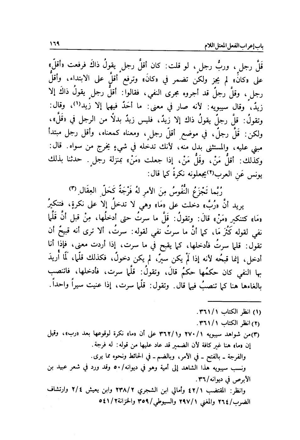 قَلَّ رجلٍ, وربُّ رجلٍ، لو قلت: كان أقلُّ رجلٍ يقولُ ذاكَ فرفعت "أقلّ" على "كانَ" لم يجز ولكن تضمر في "كانَ" وترفع أقلَّ على الابتداء، وأقلُّ رجلٍ وقلَّ رجلٌ قد أجروه مجرى النفي، فقالوا: أقلُّ رجلٍ يقولُ ذاكَ إلا زيدٌ وقال سيبويه: لأنه صار في معنى: ما أحَدٌ فيهما إلا زيد1، وقال: وتقولُ: قلَّ رجلٌ يقولُ ذاك إلا زيدٌ، فليس زيدٌ بدلًا من الرجل في "قَلَّ" ولكن: قَلَّ رجلٌ في موضعِ أقلّ رجلٍ, ومعناه كمعناه وأقل رجل مبتدأ مبني عليه, والمستثنى بدل منه لأنك تدخله في شيءٍ يخرج من سواه. قال: وكذلك: أقلُّ مَنْ, وقَلُّ مَنْ، إذا جعلت "مَنْ" بمنزلة رجلٍ. حدثنا بذلك يونس عنِ العرب2 يجعلونه نكرةً كما قال: