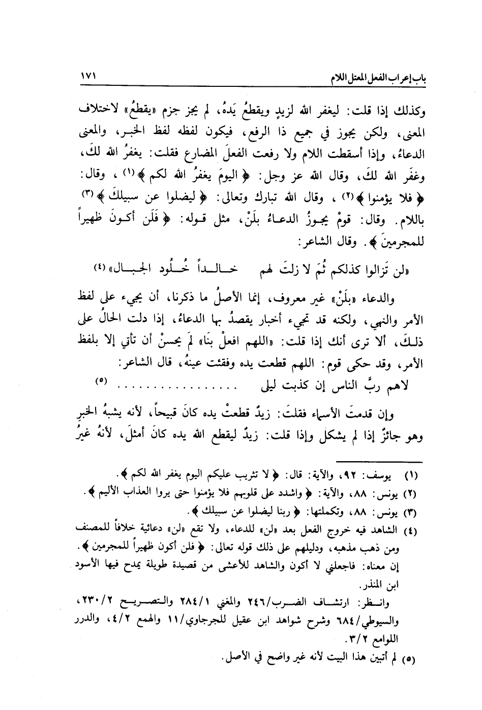 وكذلك إذا قلت: ليغفر الله لزيدٍ ويقطعُ يَدهُ، لم يجز جزم "يقطعُ" لاختلاف المعنى, ولكن يجوز في جميع ذا الرفع, فيكون لفظه لفظ الخبر, والمعنى الدعاءُ وإذا أسقطت اللام ولا رفعت الفعلَ المضارع فقلت: يغفرُ الله لكَ وغفَر الله لكَ, وقال الله عز وجل: {الْيَوْمَ يَغْفِرُ اللَّهُ لَكُمْ} 1، وقال: {فَلا يُؤْمِنُوا} 2، وقال الله تبارك وتعالى: {لِيُضِلُّوا عَنْ سَبِيلِكَ} 3 باللام. وقال قوم: يجوزُ الدعاءُ بلَنْ، مثل قوله: {فَلَنْ أَكُونَ ظَهِيرًا لِلْمُجْرِمِينَ} . وقال الشاعر: