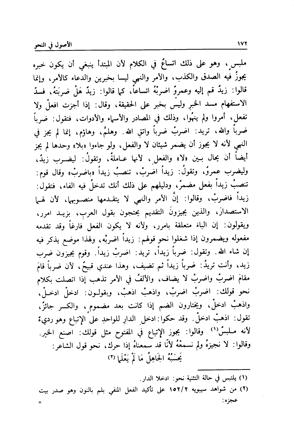ملبسٍ وهو على ذلك اتساعٌ في الكلام؛ لأن المبتدأ ينبغي أن يكون خبره يجوزُ فيه الصدق والكذب, والأمر والنهي ليسا بخبرين والدعاء كالأمر, وإنما قالوا: زيدٌ قم إليه وعمرٌو اضربْهُ اتساعًا كما قالوا: زيدٌ هَلْ ضربتَهُ، فسدّ الاستفهام مسد الخبرِ وليس بخبر على الحقيقة وقال: إذا أجزت افعلْ ولا تفعل أمروا ولم ينهُوا، وذلك في المصادر والأسماء والأدوات, فتقول: ضربًا ضربًا والله، تريد: اضربْ ضربا واتقِ الله, وهلمَّ وهاؤم إنما لم يجز في النهي؛ لأنه لا يجوز أن يضمر شيئان لا والفعل، ولو جاءوا "بلا" وحدها لم يجز أيضًا أن يحال بين "لا" والفعل؛ لأنها عاملةٌ وتقولُ: ليضرب زيدٌ وليضرب عمرو وتقولُ: زيدًا اضربْ, تنصبُ زيدًا "باضربْ" وقال قوم: تنصبُ زيدًا بفعل مضمر، ودليلهم على ذلك أنك تدخلُ فيه الفاء فتقول: زيدًا فاضربْ, وقالوا: إنَّ الأمر والنهي لا يتقدمهما منصوبهما؛ لأن لهما الاستصدارَ والذين يجيزونَ التقديم يحتجون بقول العربِ: بزيد امرر ويقولون: إن الباءَ متعلقة بامرر ولأنه لا يكون الفعل فارغًا وقد تقدمه مفعوله ويضمرون إذا شغلوا نحو قولهم: زيدًا اضربْه, ولهذا موضع يذكر فيه إن شاء الله. وتقول: ضربًا زيدًا، تريد: اضربْ زيدًا, وقوم يجيزون ضرب زيد وأنت تريدُ: ضربًا زيدًا ثم تضيف, وهذا عندي قبيحٌ لأن ضربًا قامَ مقامَ اضربْ واضربْ لا يضاف، والألفُ في الأمر تذهب إذا اتصلت بكلام نحو قولك: اضربْ اضربْ, واذهبْ اذهبْ، ويقولون: ادخلْ ادخلْ, واذهبْ ادخلْ, ويختارون الضم إذا كانت بعد مضمومٍ والكسر جائزٌ, تقول: اذهبْ ادخلْ. وقد حكوا: ادخلِ الدارِ للواحدِ على الإِتباع وهو رديءٌ لأنه ملبسٌ1, وقالوا: يجوز الإِتباع في المفتوح مثل قولك: اصنع الخير. وقالوا: لا نجيزهُ ولم نسمعْهُ لأنّا قد سمعناهُ إذا حرك، نحو قول الشاعر: