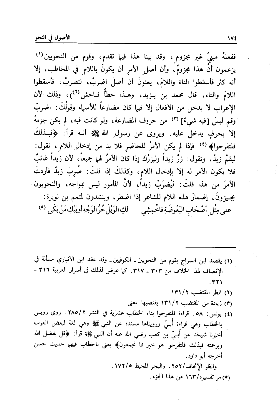1 يقصد ابن السراج بقوم من النحويين: الكوفيين, وقد عقد ابن الأنباري مسألة في الإنصاف لهذا الخلاف من 303-317, كما عرض لذلك في أسرار العربية 316-321.