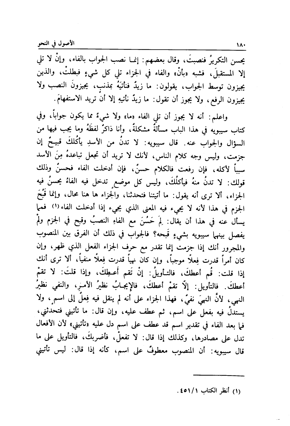 واعلم: أنه لا يجوز أن تلي الفاء "ما" ولا شيءٌ مما يكون جوابًا، وفي كتاب سيبويه في هذا الباب مسألةٌ مشكلةٌ, وأنا ذاكرٌ لفظَهُ وما يجب فيها من السؤال والجواب عنه. قال سيبويه: لا تدنُ من الأسدِ يأكُلكَ قبيحٌ إن جزمت وليس وجه كلام الناس؛ لأنك لا تريد أن تجعل تباعدهُ مِنَ الأسد سببًا لأكله, فإن رفعت فالكلام حسنٌ، فإن أدخلت الفاء فحسنٌ وذلك قولك: لا تدنُ منهُ فيأكلُكَ, وليس كل موضعٍ تدخل فيه الفاءُ يحسنُ فيه الجزاء, ألا ترى أنه يقول: ما أتيتنا فتحدثنا, والجزاء ههنا محال, وإنما قَبُحَ الجزم في هذا لأنه لا يجيء فيه المعنى الذي يجيء إذا أدخلت الفاء1 فمما يسأل عنه في هذا أن يقال: لِمَ حَسُنَ مع الفاءِ النصبُ وقبح في الجزم ولمْ يفصل بينهما سيبويه بشيءٍ قَبحه؟ فالجواب في ذلك أن الفرق بين المنصوب والمجرور أنك إذا جزمت إنما تقدر مع حرف الجزاء الفعل الذي ظهر, وإن كان أمرًا قدرت فِعلًا موجبًا, وإن كان نهيًا قدرت فِعلًا منفيًّا, ألا ترى أنك إذا قلت: قُم أعطكَ فالتأويلُ: إنْ تَقم أعطِكَ, وإذا قلتَ: لا تقمْ أعطكَ, فالتأويل: إلاّ تقمْ أعطكَ, فالإِيجابُ نظيرُ الأمرِ والنفي نظيرُ النهي؛ لأنَّ النهيَ نفيٌ فهذا الجزاء على أنه لم ينقل فيه فِعلٌ إلى اسمٍ, ولا يستدل فيه بفعل على اسم ثم عطف عليه, وإن قال: ما تأتيني فتحدثني, فما بعد الفاء في تقدير اسم قد عطف على اسم دل عليه "تأتيني" لأن الأفعال تدل على مصادرها, وكذلك إذا قال: لا تفعلْ فأضربكَ، فالتأويل على ما قال سيبويه أن المنصوب معطوفٌ على اسم، كأنه إذا قال: ليس تأتيني