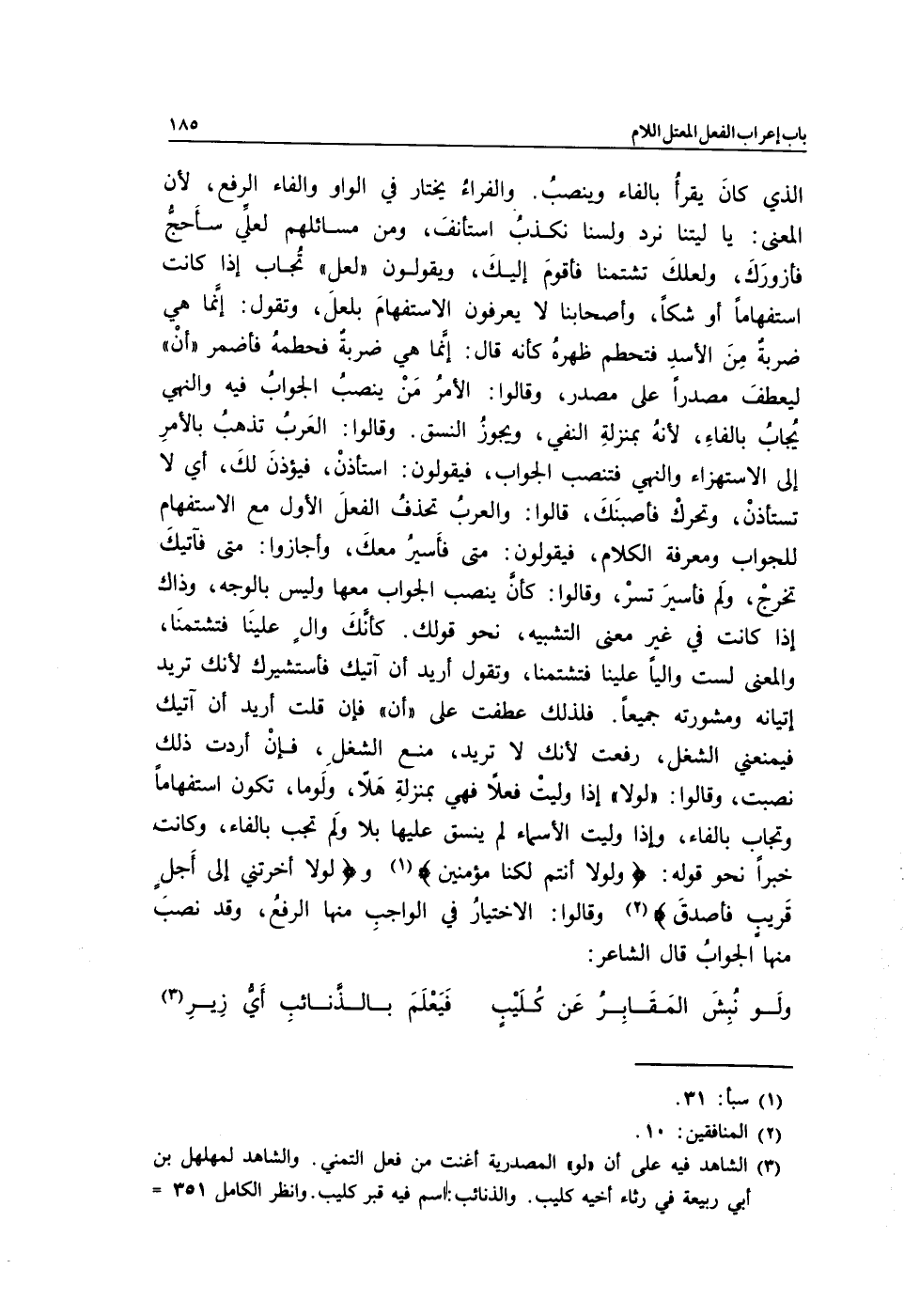 الذي كانَ يقرأُ بالفاء وينصبُ. والفراءُ يختار في الواو والفاء الرفع؛ لأن المعنى: يا ليتنا نرد ولسنا نكذبُ استأنفَ, ومن مسائلهم: لعلِّي سأَحجُّ فأزورَكَ, ولعلكَ تشتمنا فأقومَ إليكَ, ويقولون "لعل" تُجاب إذا كانت استفهامًا أو شكًّا, وأصحابنا لا يعرفون الاستفهامَ بلعلَ, وتقول: إنَّما هي ضربةٌ مِنَ الأسدِ فتحطم ظهرهُ كأنه قال: إنَّما هي ضربةٌ فحطمهُ فأضمر "أنْ" ليعطفَ مصدرًا على مصدر, وقالوا: الأمرُ مَنْ ينصبُ الجوابُ فيه والنهي يُجابُ بالفاءِ؛ لأنهُ بمنزلةِ النفي ويجوزُ النسق. وقالوا: العَربُ تذهبُ بالأمر إلى الاستهزاء والنهي فتنصب الجواب, فيقولون: استأذنْ فيؤذنَ لكَ أي: لا تستأذنْ وتحركْ فأصبنكَ, قالوا: والعربُ تحذفُ الفعلَ الأول مع الاستفهام للجواب ومعرفة الكلام, فيقولون: متى فأَسيرُ معكَ وأجازوا: متى فآتيكَ تخرجْ ولَم فأسيرَ تسرْ, وقالوا: كأنَّ ينصب الجواب معها وليس بالوجه, وذاك إذا كانت في غير معنى التشبيه, نحو قولك: كأنَّكَ والٍ علينَا فتشتمنَا، والمعنى لست واليًا علينا فتشتمنا, وتقول: أريد أن آتيك فأستشيرك؛ لأنك تريد إتيانه ومشورته جميعًا. فلذلك عطفت على "أن" فإن قلت: أريد أن آتيك فيمنعني الشغل, رفعت لأنك لا تريد منع الشغلِ، فإنْ أردت ذلك نصبت وقالوا: "لولا" إذا وليتْ فعلًا فهي بمنزلةِ هَلاّ، ولَو ما, تكون استفهامًا وتجاب بالفاء, وإذا وليت الأسماء لم ينسق عليها بلا ولَم تجب بالفاء، وكانت خبرًا نحو قوله: {لَوْلا أَنْتُمْ لَكُنَّا مُؤْمِنِينَ} 1 و {لَوْلا أَخَّرْتَنِي إِلَى أَجَلٍ قَرِيبٍ فَأَصَّدَّقَ} 2 وقالوا: الاختيارُ في الواجبِ منها الرفعُ، وقد نصبَ منها الجوابُ, قال الشاعر: