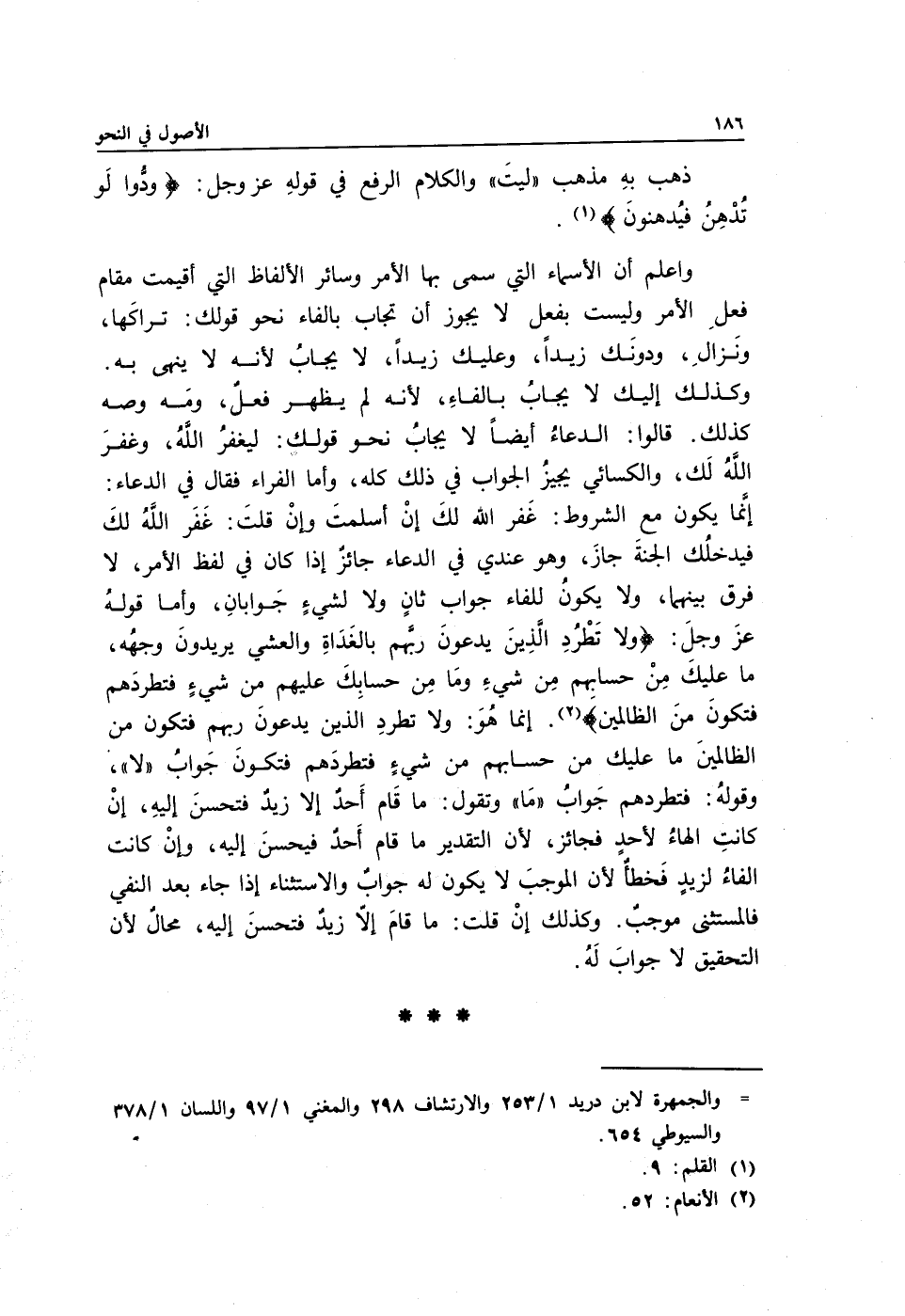 واعلم: أن الأسماء التي سمي بها الأمر وسائر الألفاظ التي أقيمت مقام فعلِ الأمر وليست بفعل لا يجوز أن تجاب بالفاء نحو قولك: تراكَها ونَزالِ ودونَك زيدًا وعليك زيدًا, لا يجابُ لأنه لا ينهى به. وكذلك إليك لا يجابُ بالفاءِ؛ لأنه لم يظهر فعلٌ, ومَه وصه كذلك. قالوا: الدعاءُ أيضًا لا يجابُ نحو قولك: ليغفرُ اللَّهُ وغفرَ اللَّهُ لَك، والكسائي يجيزُ الجواب في ذلك كله وأما الفراء فقال في الدعاء: إنَّما يكون مع الشروط: غَفر الله لكَ إنْ اسلمتَ, وإنْ قلتَ: غَفَر اللَّهُ لكَ فيدخلُك الجنةَ جازَ، وهو عندي في الدعاء جائزٌ إذا كان في لفظ الأمر, لا فرق بينهما ولا يكونُ للفاء جواب ثانٍ ولا لشيءٍ جَوابانِ، وأما قولهُ عزَّ وجلَّ: {وَلا تَطْرُدِ الَّذِينَ يَدْعُونَ رَبَّهُمْ بِالْغَدَاةِ وَالْعَشِيِّ يُرِيدُونَ وَجْهَهُ مَا عَلَيْكَ مِنْ حِسَابِهِمْ مِنْ شَيْءٍ وَمَا مِنْ حِسَابِكَ عَلَيْهِمْ مِنْ شَيْءٍ فَتَطْرُدَهُمْ فَتَكُونَ مِنَ الظَّالِمِينَ} 2 إنما هُوَ: ولا تطردِ الذين يدعونَ ربهم فتكون من الظالمينَ ما عليك من حسابهم من شيءٍ فتطردَهم فتكونَ جَوابُ "لا" وقولهُ: فتطردهم جَوابُ "مَا" وتقول: ما قاَم أَحدٌ إلا زيدٌ فتحسنَ إليهِ، إنْ كانتِ الهاءُ لأحدٍ فجائز؛ لأن التقدير ما قام أَحدٌ فيحسنَ إليه وإنْ كانت الفاءُ لزيدٍ فَخطأٌ لأن الموجبَ لا يكون له جوابٌ والاستثناء إذا جاء بعد النفي فالمستثنى موجبٌ. وكذلك إنْ قلت: ما قامَ إلاّ زيدٌ فتحسنَ إليه، محالٌ لأن التحقيق لا جوابَ لَهُ.