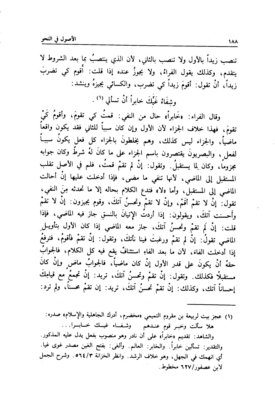 وقال الفراء: "خَابرًا" حال من النفي: قمتُ كي تقومَ، وأقومُ كَيْ تقومَ, فهذا خلاف الجزاء لأن الأول وإن كان سببًا للثاني فقد يكون واقعًا ماضيًا والجزاء ليس كذلك، وهم يخلطونَ بالجزاء كل فعل يكونُ سببًا لفعلٍ, والبصريونَ يقتصرون باسم الجزاء على ما كانَ لهُ شرطٌ وكان جوابه مجزومًا وكان لِما يستقبلُ. وتقول: إنْ لم تقمْ قمتُ فلم في الأصل تقلب المستقبل إلى الماضي؛ لأنها تنفي ما مضى فإذا أدخلت عليها إنْ أحالت الماضي إلى المستقبل, وأما "لا" فتدع الكلام بحاله إلا ما تحدثه مِنَ النفي تقول: إنْ لا تقمْ أقَمْ, وإنْ لا تقمْ وتحسنُ آتكَ، وقوم يجيزون: إنْ لا تقمْ وأَحسنت آتكَ ويقولون: إذا أردت الإِتيانَ بالنسقِ جاز فيه الماضي, فإذا قلت: إنْ لَم تقمْ وتحسنُ آتكَ جاز معه الماضي إذا كان الأول بتأويلِ الماضي تقولُ: إنْ لم تقمْ ورغبتَ فينا نأتكَ, وتقول: إنْ تقمْ فأقومُ فترفعُ إذا أدخلت الفاءَ؛ لأن ما بعد الفاءِ استئنافٌ يقع فيه كل الكلام، فالجوابُ حقهُ أنْ يكونَ على قدر الأول إنْ كان ماضيًا فالجوابُ ماضٍ, وإنْ كانَ مستقبلًا فكذلك. وتقول: إنْ تقمْ وتحسنُ آتكَ، تريد: إنْ تجمع مع قيامِكَ إحسانًا آتك، وكذلك: إنْ تقمْ تحسنُ آتكَ، تريد: إنْ تقمْ محسنًا، ولم ترد: