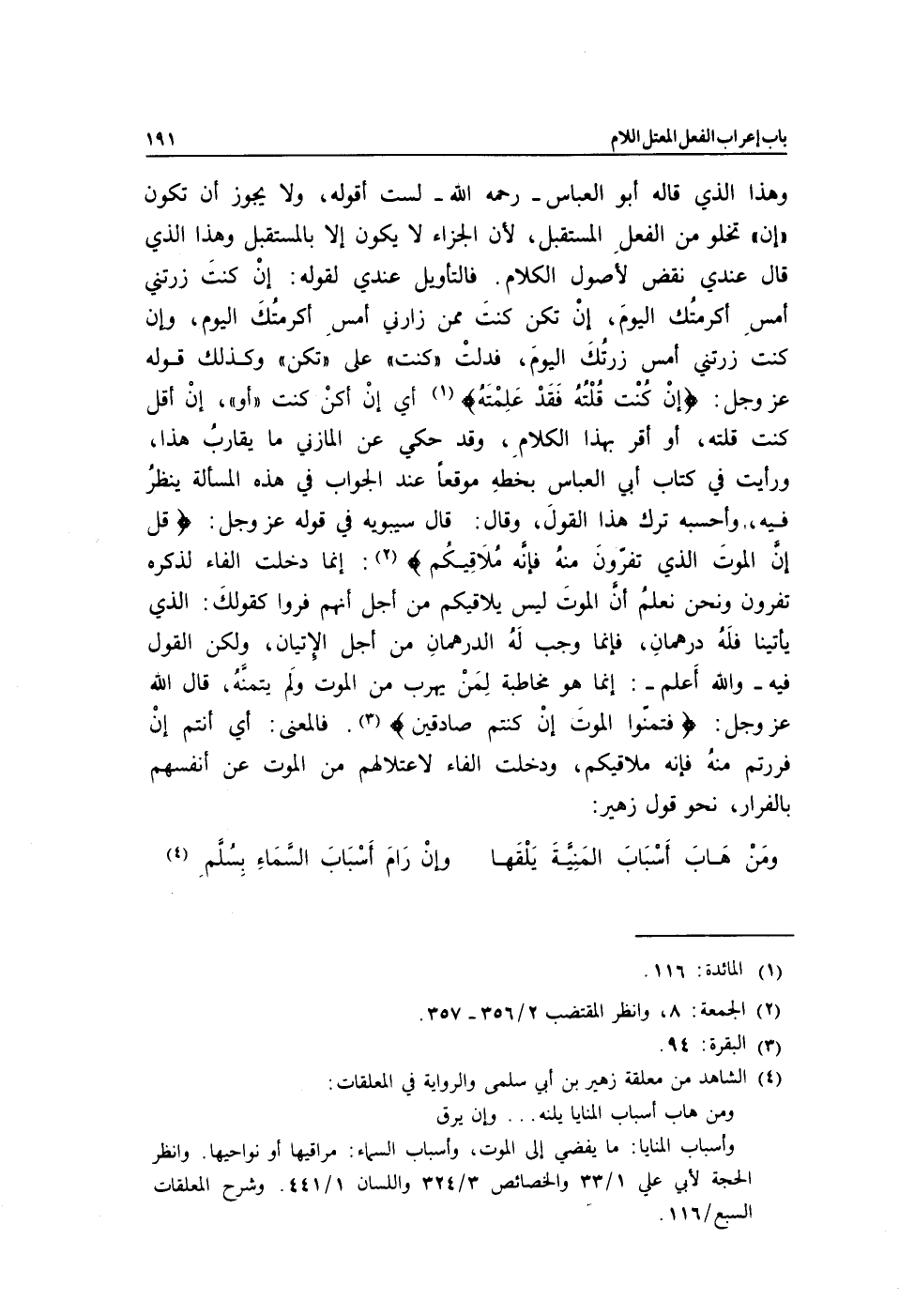 وهذا الذي قاله أبو العباس -رحمه الله- لست أقوله، ولا يجوز أن تكون "إن" تخلو من الفعلِ المستقبل؛ لأن الجزاء لا يكون إلا بالمستقبل وهذا الذي قال عندي نقض لأصول الكلام. فالتأويل عندي لقوله: إنْ كنتَ زرتني أمسِ أكرمتُك اليومَ, إنْ تكن كنتَ ممن زارني أمسِ أكرمتُكَ اليوم وإن كنت زرتني أمس زرتُكَ اليومَ, فدلتْ "كنت" على "تكن" وكذلك قوله عز وجل: {إِنْ كُنْتُ قُلْتُهُ فَقَدْ عَلِمْتَهُ} 1 أي: إنْ أكنْ كنت "أو" إنْ أقل كنت قلته, أو أقر بهذا الكلامِ, وقد حكي عن المازني ما يقاربُ هذا، ورأيت في كتاب أبي العباس بخطهِ موقعًا عند الجواب في هذه المسألة ينظرُ فيه, وأحسبه ترك هذا القولَ وقال: قال سيبويه في قوله عز وجل: {قُلْ إِنَّ الْمَوْتَ الَّذِي تَفِرُّونَ مِنْهُ فَإِنَّهُ مُلاقِيكُمْ} 2: إنما دخلت الفاء لذكره تفرون ونحن نعلمُ أنَّ الموتَ ليس يلاقيكم من أجل أنهم فروا كقولكَ: الذي يأتينا فلَهُ درهمانِ, فإنما وجب لَهُ الدرهمانِ من أجل الإِتيان, ولكن القول فيه, والله أَعلم: إنما هو مخاطبة لِمَنْ يهرب من الموت ولَم يتمنَّه، قال الله عز وجل: {فَتَمَنَّوُا الْمَوْتَ إِنْ كُنْتُمْ صَادِقِين} 3 فالمعنى: أي أنتم إنْ فررتم منهُ فإنه ملاقيكم، ودخلت الفاء لاعتلالهم من الموت عن أنفسهم بالفرار، نحو قول زهير: