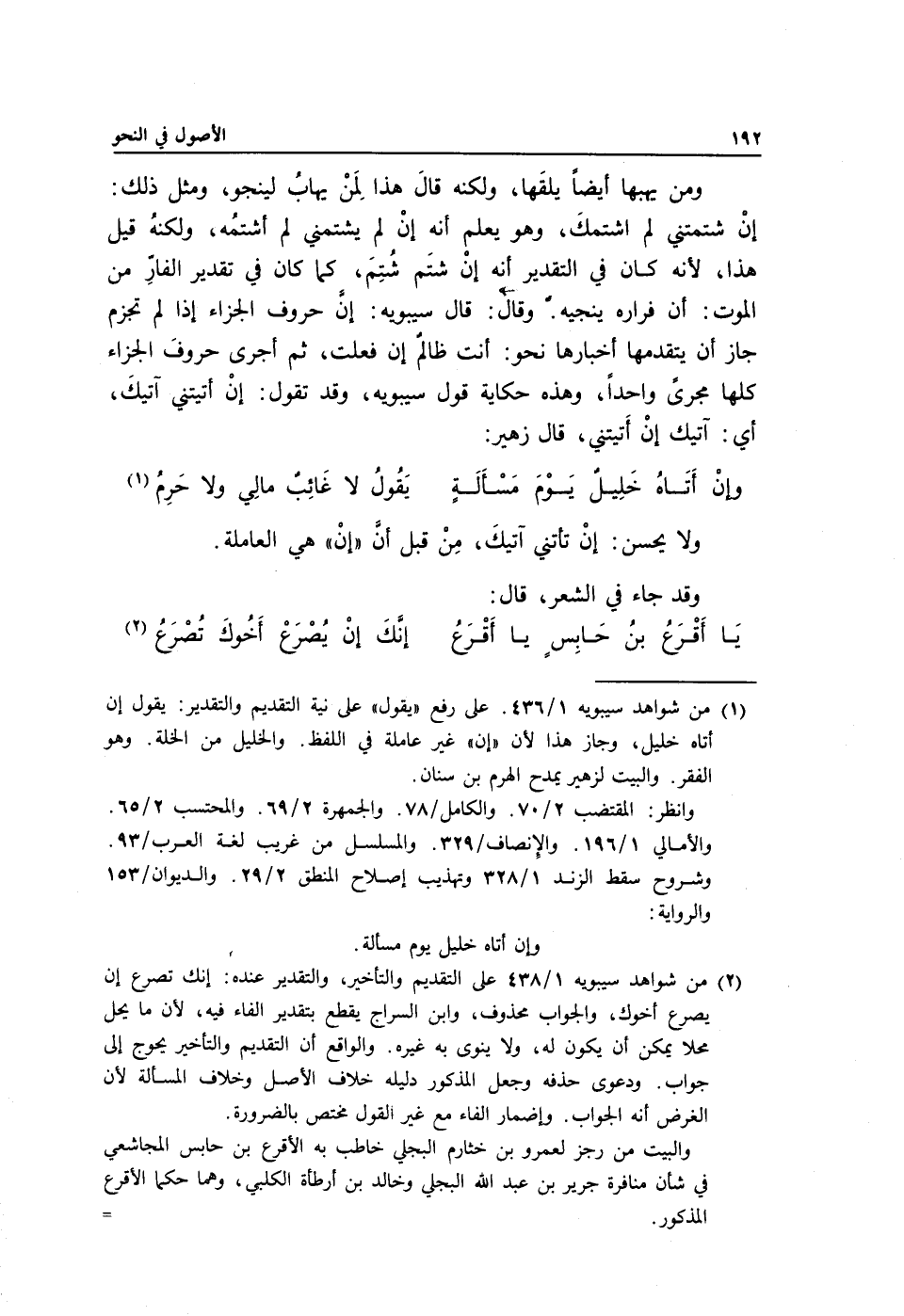2 من شواهد سيبويه 1/ 438 على التقديم والتأخير، والتقدير عنده: إنك تصرع إن يصرع أخوك، والجواب محذوف، وابن السراج يقطع بتقدير الفاء فيه؛ لأن ما يحل محلا يمكن أن يكون له، ولا ينوي به غيره. والواقع أن التقديم والتأخير يحوج إلى جواب, ودعوى حذفه وجعل المذكور دليله خلاف الأصل وخلاف المسألة؛ لأن الغرض أنه الجواب, وإضمار الفاء مع غير القول مختص بالضرورة.