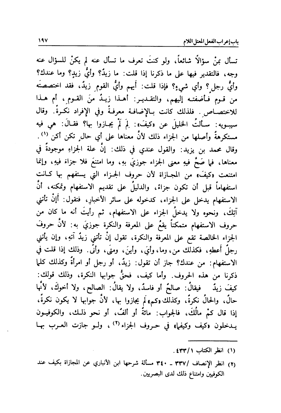 2 انظر الإنصاف/ 337-340 مسألة شرحها ابن الأنباري عن المجازاة بكيف عند الكوفيين, وامتناع ذلك لدى البصريين.