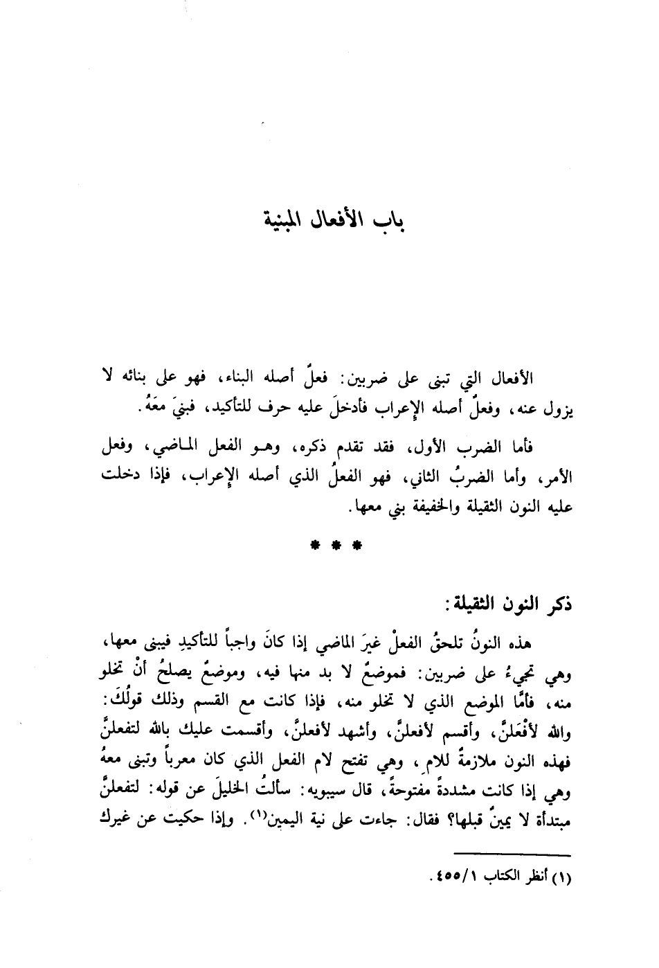 فأما الضرب الأول، فقد تقدم ذكره، وهو الفعل الماضي، وفعل الأمر, وأما الضربُ الثاني فهو الفعلُ الذي أصله الإِعراب, فإذا دخلت عليه النون الثقيلة والخفيفة بني معهما.
