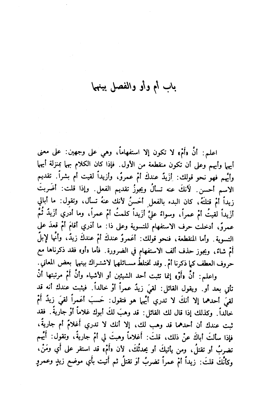 اعلم: أنَّ "أَمْ" لا تكون إلا استفهامًا، وهي على وجهين: على معنى أيهما وأيهم, وعلى أن تكون منقطعة من الأول. فإذا كان الكلام بها بمنزلة أيهما وأيّهم فهو نحو قولك: أزَيدٌ عندكَ أمْ عمرٌو؟ وأزيدًا لقيت أم بشرًا؟ تقديم الاسم أحسن؛ لأَنكَ عنه تسألُ ويجوزُ تقديم الفعل. وإذا قلت: أضَربتَ زيدًا أمْ قتلتَهُ كان البدء بالفعلِ أحَسن لأنك عنهُ تسأل، وتقول: ما أبالي أزَيدًا لقيتُ أمْ عمرًا وسواءٌ عليَّ أزَيدًا كلمتُ أمْ عمرًا، وما أدَري أزيدٌ ثُمَّ عمرو أدخلت حرف الاستفهام للتسوية وعلى ذا: ما أدري أقامَ أمْ قعدَ على التسوية. وأما المنقطعة، فنحو قولك: أعَمرٌو عندكَ أمْ عندكَ زيدٌ؟ وإنَّها لإِبلٌ أَمْ شاءٌ؟ ويجوز حذف ألف الاستفهام في الضرورة. فأما "أو" فقد ذكرناها مع حروف العطف كما ذكرنا أمْ, وقد تختلطُ مسائلهما لاشتراك بينهما في بعض المعاني.