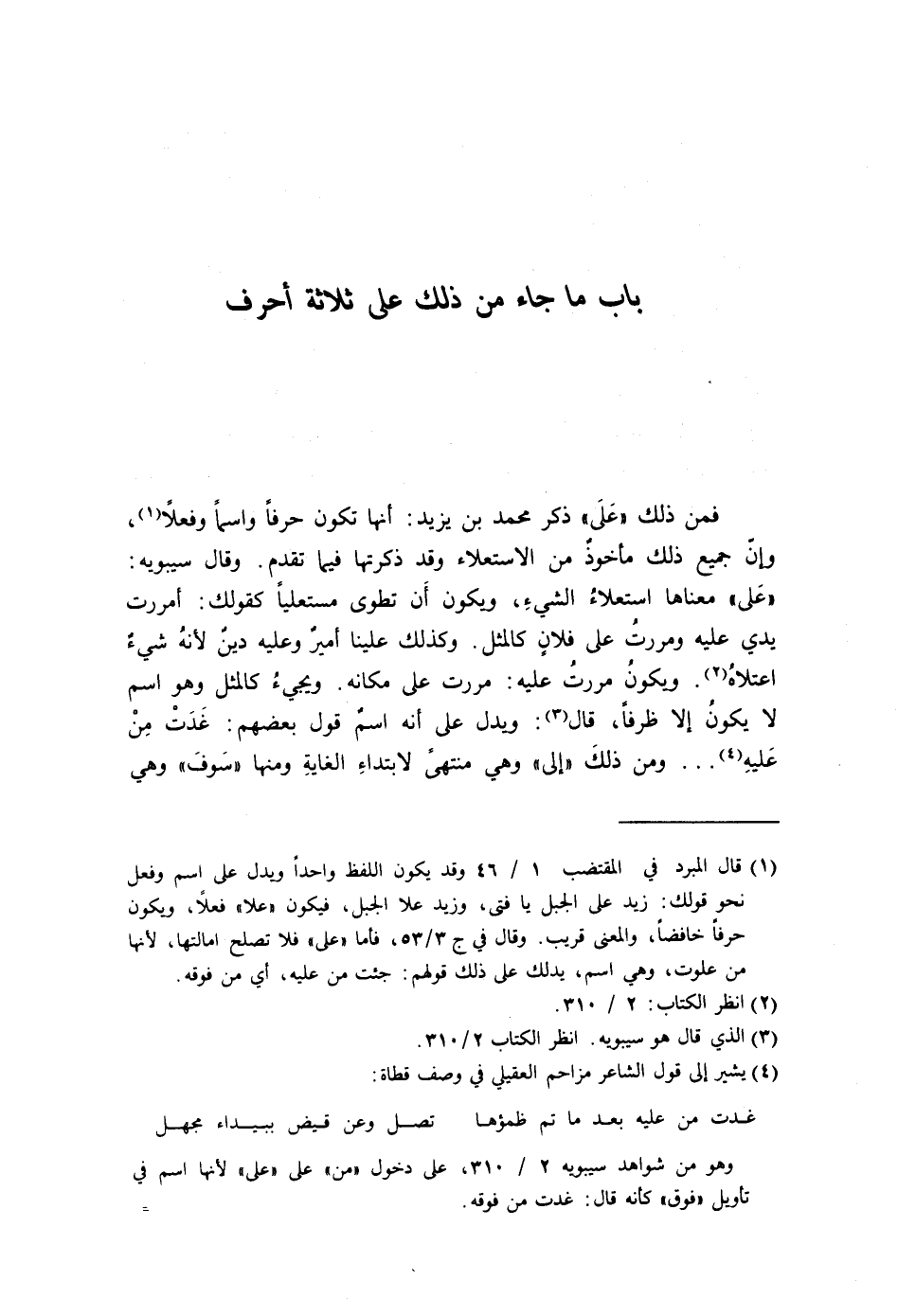 فمن ذلك "عَلَى" ذكر محمد بن يزيد أنها تكون حرفًا واسمًا وفعلًا1، وأنّ جميع ذلك مأخوذٌ من الاستعلاء وقد ذكرتها فيما تقدم. وقال سيبويه: "عَلى" معناها استعلاءُ الشيءِ، ويكون أَن تطوي مستعليًا كقولك: أمررت يدي عليه ومررتُ على فلانٍ كالمثل, وكذلك علينا أميرٌ وعليه دينٌ؛ لأنهُ شيءٌ اعتلاهُ2, ويكونُ مررتُ عليه: مررت على مكانه. ويجيءُ كالمثل وهو اسم لا يكونُ إلا ظرفًا، قال3: ويدل على أنه اسمٌ قول بعضهم: غَدَتْ مِنْ عَليهِ4.... ومن ذلكَ "إلى" وهي منتهًى لابتداءِ الغايةِ ومنها "سَوفَ" وهي