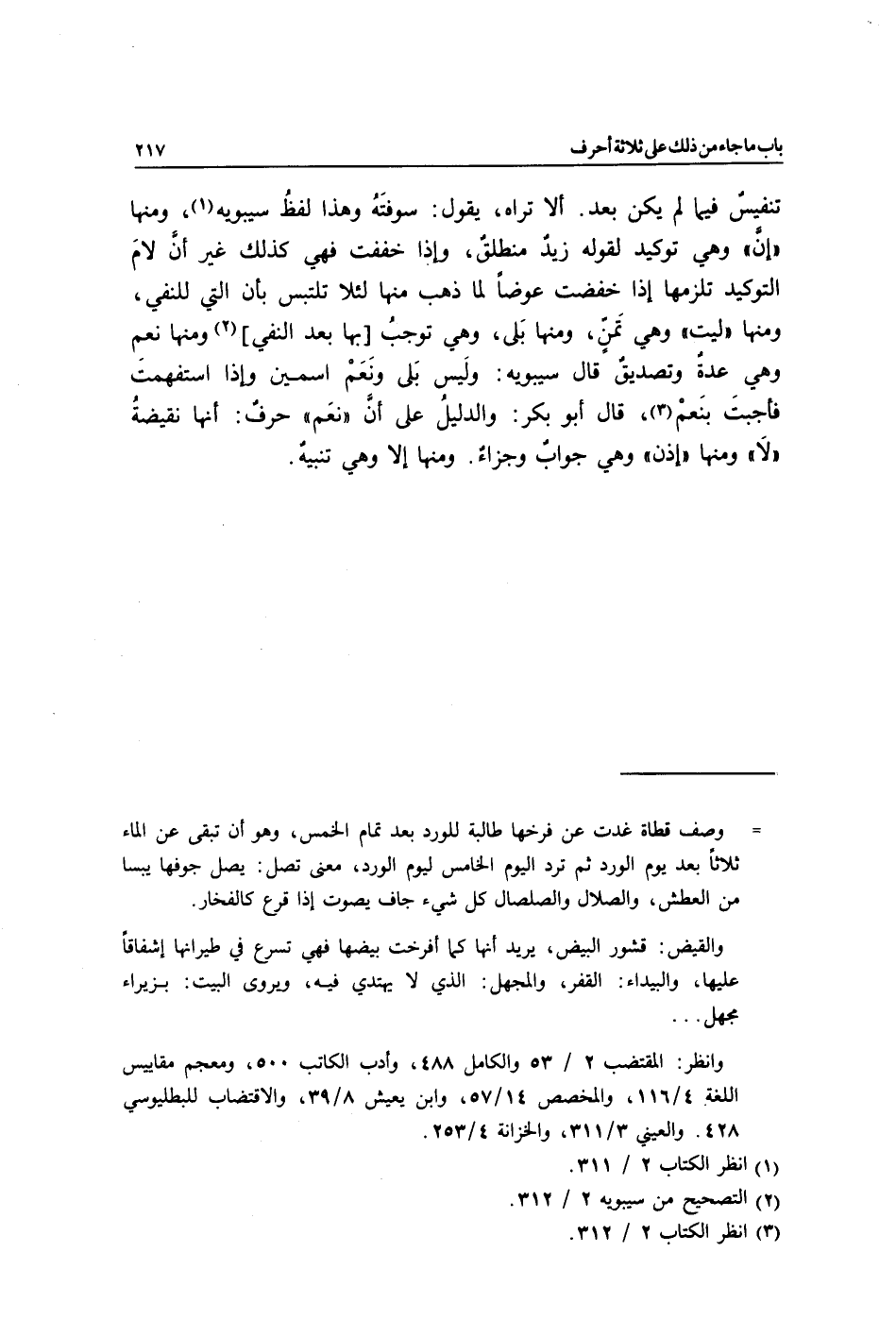 تنفيسٌ فيما لم يكن بعد. ألا تراه يقول: سوفتهُ وهذا لفظُ سيبويه1، ومنها "إنَّ" وهي توكيد لقوله: زيدٌ منطلقٌ، وإذا خففت فهي كذلك غير أنَّ لامَ التوكيد تلزمها إذا خفضت عوضًا لما ذهب منها لئلا تلتبس بأن التي للنفي، ومنها "ليت" وهي تَمنٍّ, ومنها بَلى, وهي توجبُ [بها بعد النفي] 2 ومنها نعم وهي عدةٌ وتصديقٌ, قال سيبويه: ولَيس بَلى ونَعَمْ اسمين وإذا استفهمتَ فأجبتَ بنَعمْ3، قال أبو بكر: والدليلُ على أنَّ "نعَم" حرفٌ, أنها نقيضةُ "لا" ومنها "إذن" وهي جوابٌ وجزاءٌ, ومنها إلا وهي تنبيهٌ.