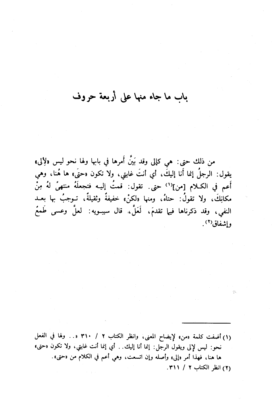 من ذلك: حتى, هي كإلى وقد بين أَمرها في بابها ولها نحو ليس "لإِلى" يقول الرجلُ: إنما أَنا إليكَ أي: أنتَ غايتي ولا تكون "حتى" ههُنا، وهي أَعم في الكلام [من] 1 حتى. تقول: قمتُ إليه فتجعلهُ منتهًى لهُ مِنْ مكانِكَ، ولا تقولُ: حتاهُ، ومنها "لكنْ" خفيفةٌ وثقيلةٌ, توجبُ بها بعد النفي, وقد ذكرناها فيما تقدمَ. لَعَلَّ, قال سيبويه: لعلَّ وعسى طَمعٌ وإشفاق2.
