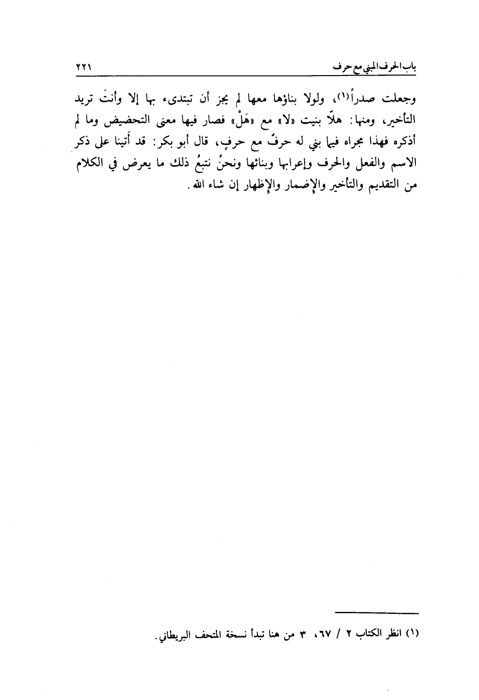 وجعلت صدرًا1، ولولا بناؤها معها لم يجز أن تبتدئ بها إلا وأنتَ تريد التأخير، ومنها: هلاّ بنيت "لا" مع "هَلْ" فصار فيها معنى التحضيض وما لم أذكره فهذا مجراه فيما بني له حرفٌ مع حرفٍ، قال أبو بكر: قد أَتينا على ذكر الاسم والفعل والحرف وإعرابها وبنائها ونحنُ نتبعُ ذلك ما يعرض في الكلام من التقديم والتأخير والإِضمار والإِظهار, إن شاء الله.