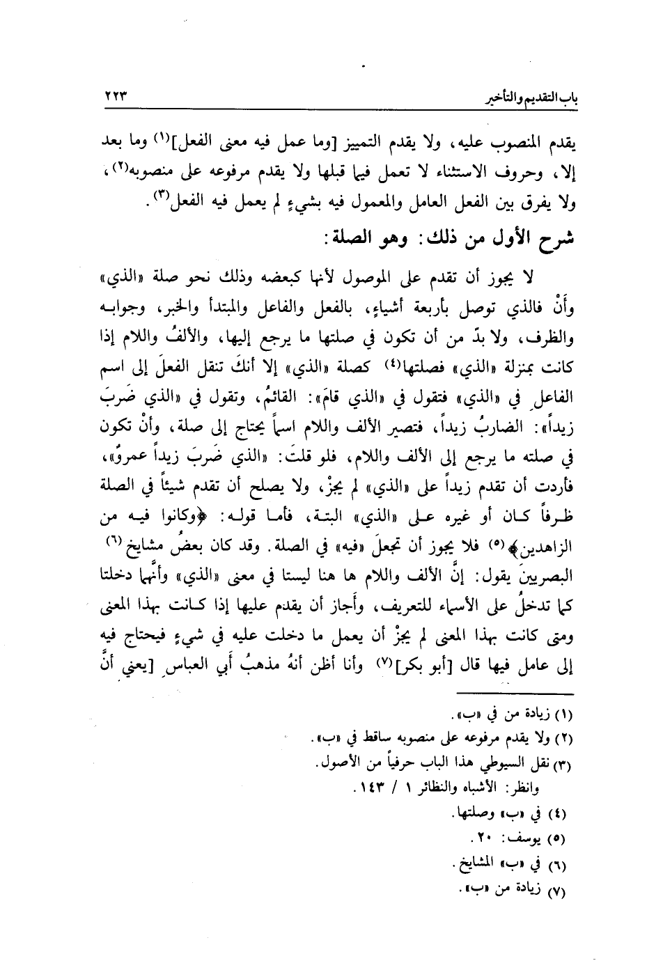 لا يجوز أن تقدم على الموصول؛ لأنها كبعضه وذلك نحو صلة "الذي" وأَنْ فالذي توصل بأربعة أشياء؛ بالفعل والفاعل والمبتدأ والخبر وجوابه والظرف ولا بدّ من أن تكون في صلتها ما يرجع إليها، والألف واللام إذا كانت بمنزلة "الذي" فصلتها1 كصلة "الذي" إلا أنكَ تنقل الفعلَ إلى اسم الفاعلِ في "الذي" فتقول في "الذي قامَ": القائمُ, وتقول في "الذي ضَربَ زيدًا": الضاربُ زيدًا, فتصير الألف واللام اسمًا يحتاج إلى صلة، وأنْ تكون في صلته ما يرجع إلى الألف واللام, فلو قلتَ: "الذي ضَربَ زيدًا عمرٌو" فأردت أن تقدم زيدًا على "الذي" لم يجزْ ولا يصلح أن تقدم شيئًا في الصلة ظرفًا كان أو غيره على "الذي" ألبتة، فأما قوله: {وَكَانُوا فِيهِ مِنَ الزَّاهِدِينَ} 2 فلا يجوز أن تجعلَ "فيه" في الصلة. وقد كان بعضُ مشايخ3 البصريين يقول: إنَّ الألف واللام ههنا ليستا في معنى "الذي" وإنَّهما دخلتا كما تدخلان على الأسماء للتعريف، وأَجاز أن يقدم عليها إذا كانت بهذا المعنى ومتى كانت بهذا المعنى لم يجزْ أن يعمل ما دخلت عليه في شيءٍ فيحتاج فيه إلى عامل فيها, قال [أبو بكر] 4: وأنا أظن أنهُ مذهبُ أَبي العباسِ [يعني أنَّ